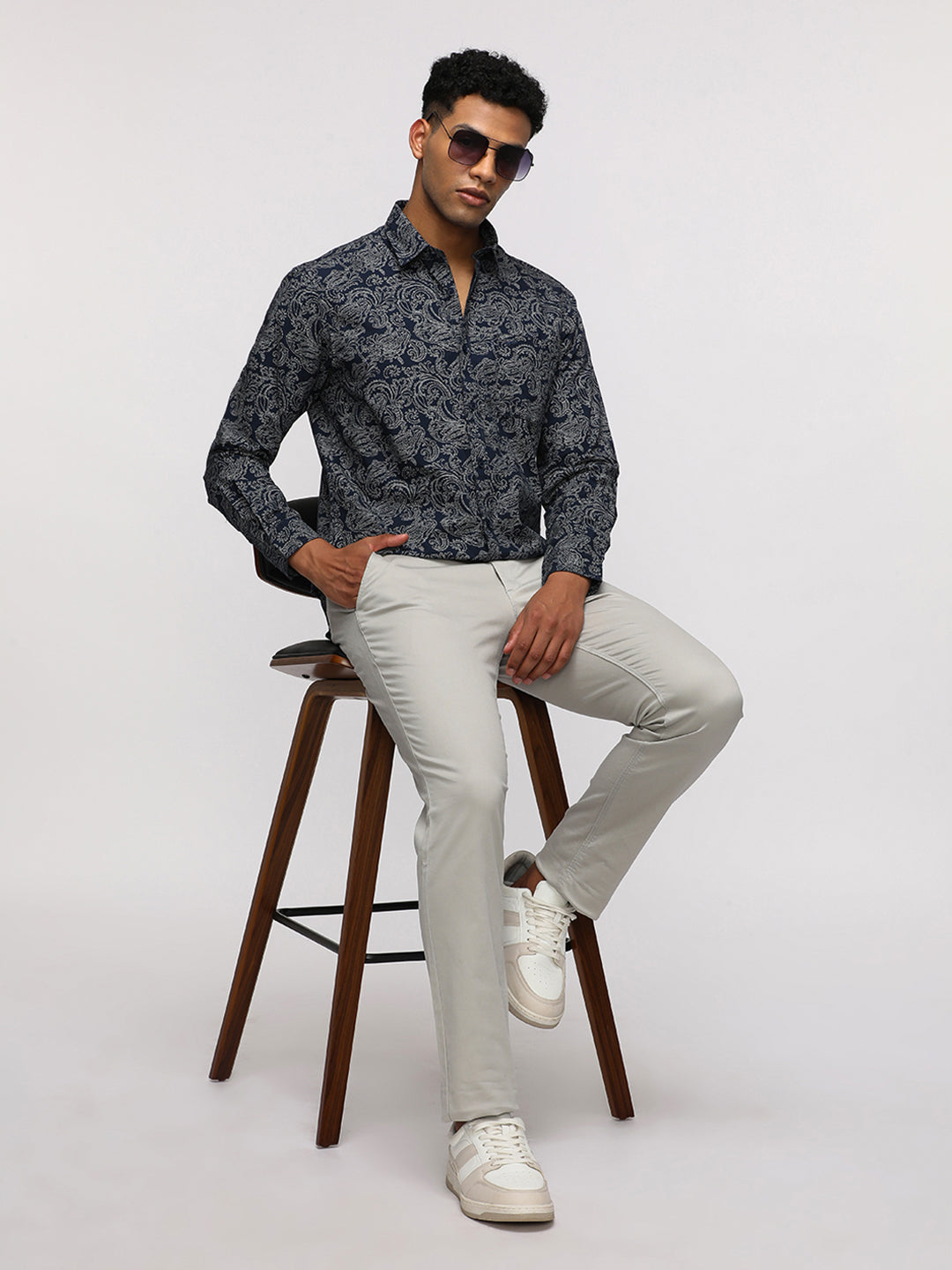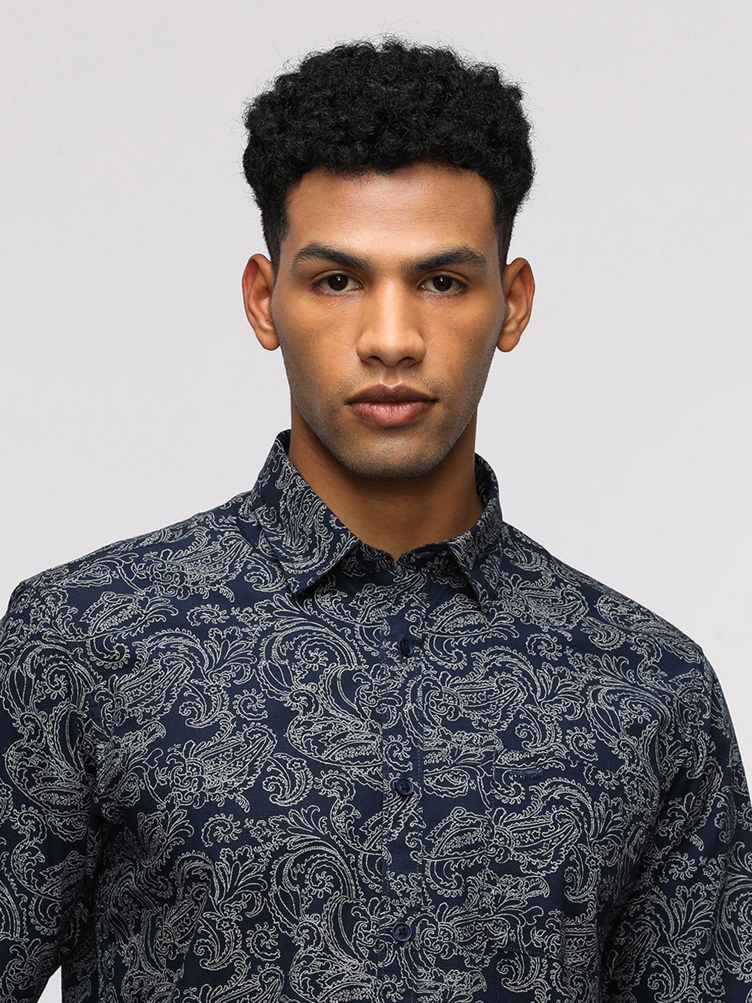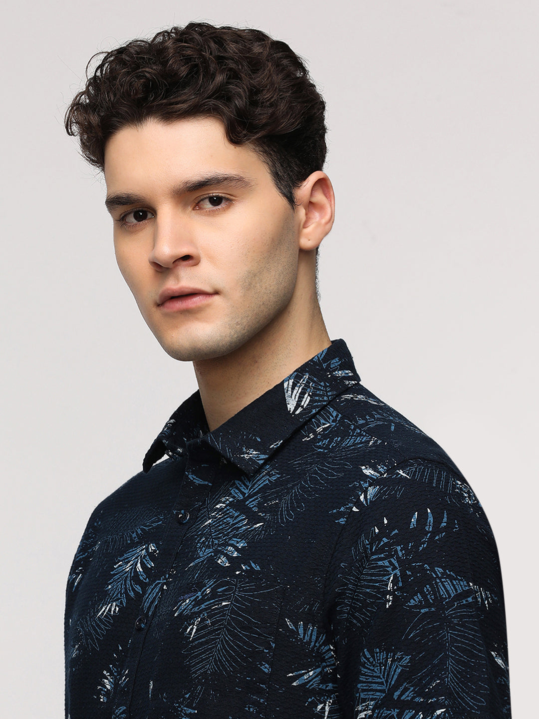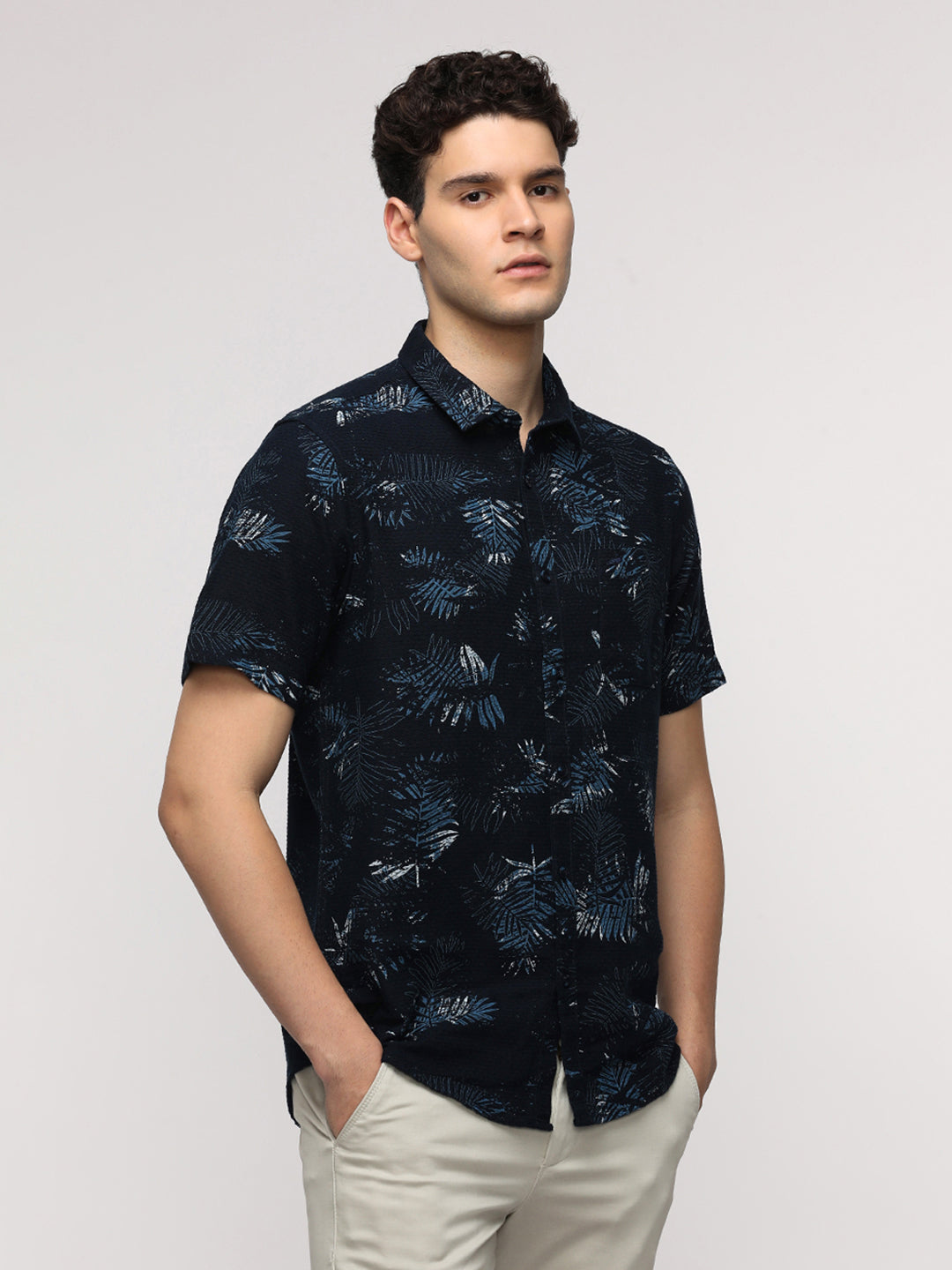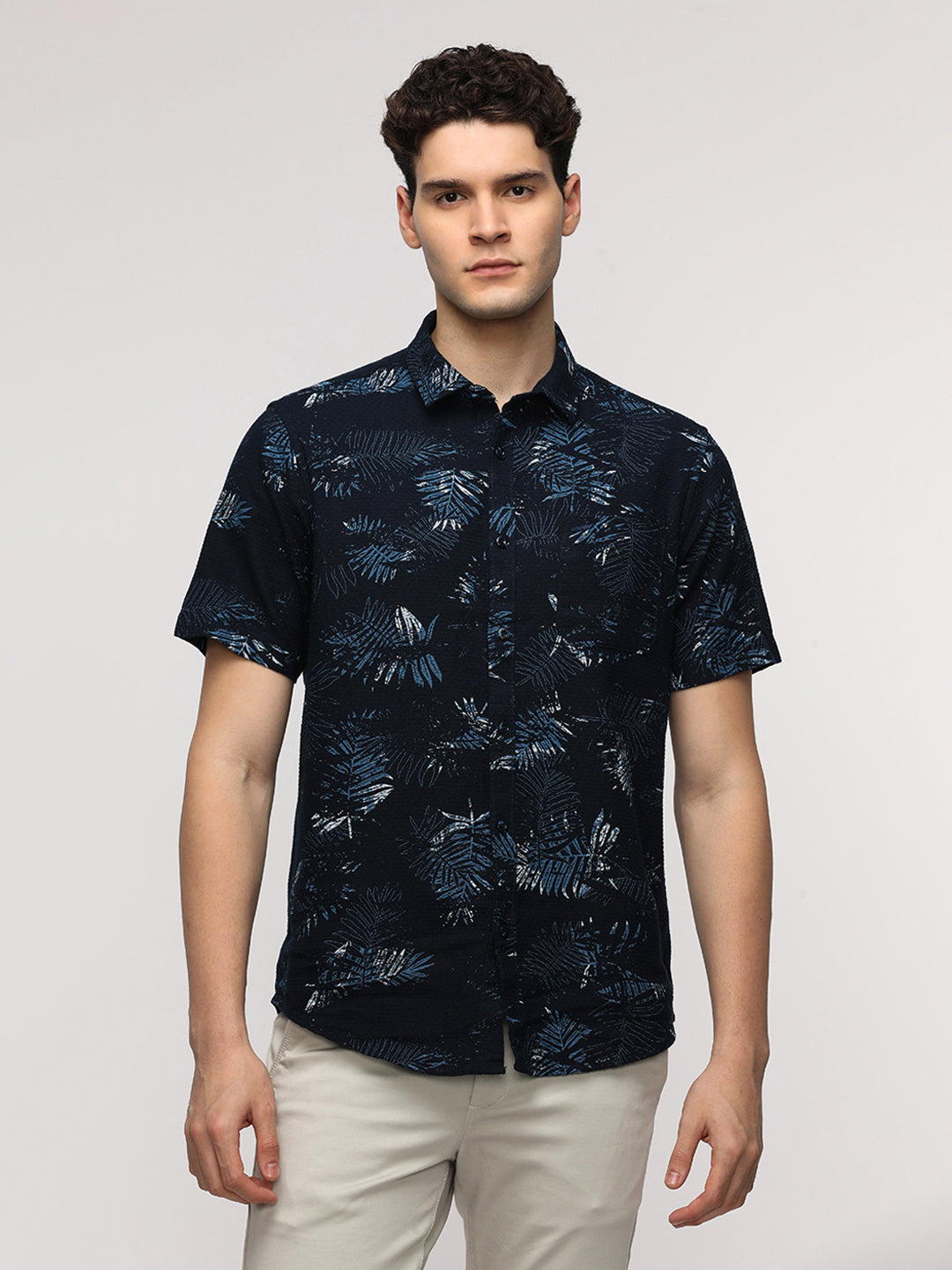 Navy Printed Half Sleeve Casual 100% Cotton Shirt