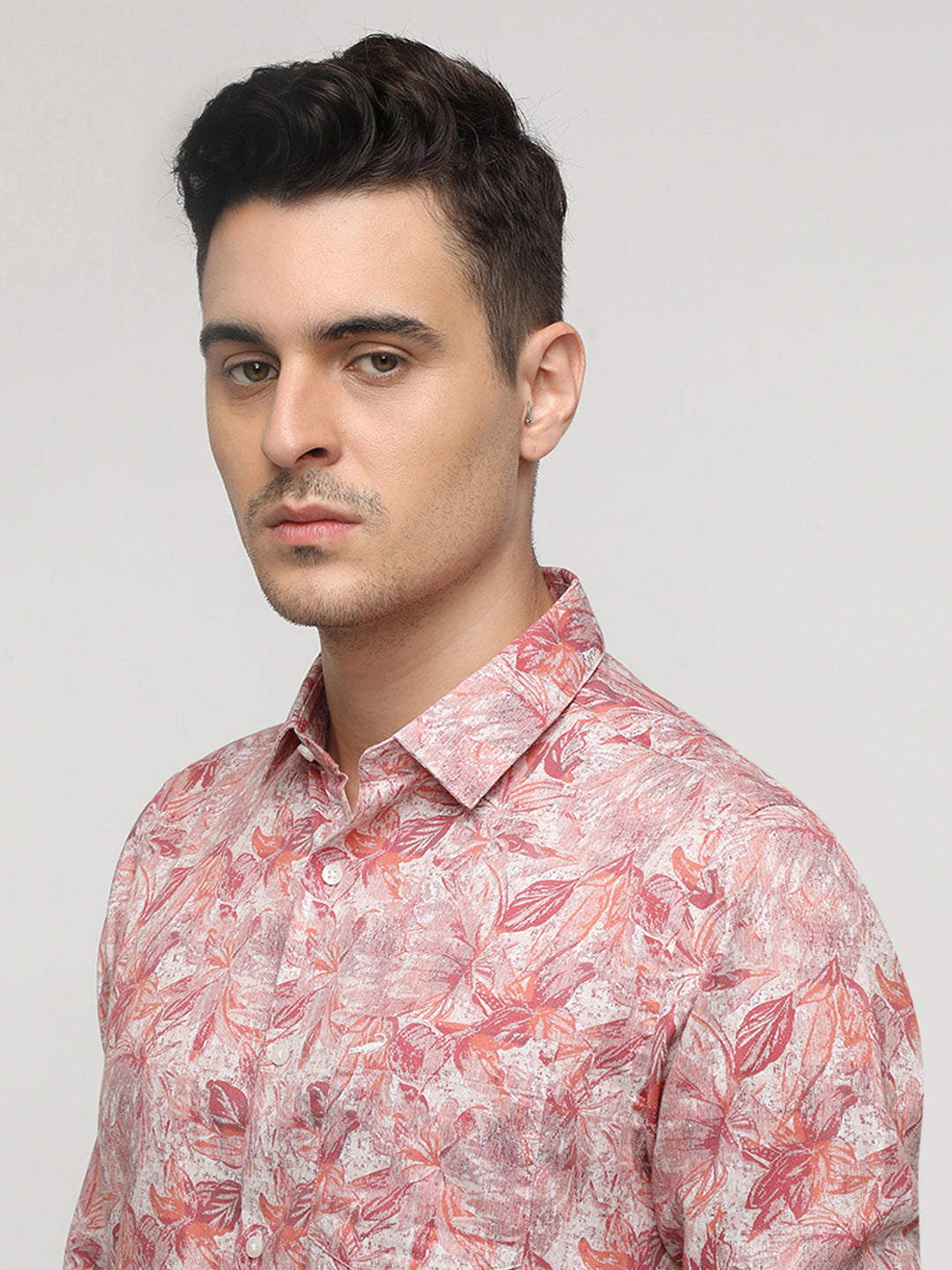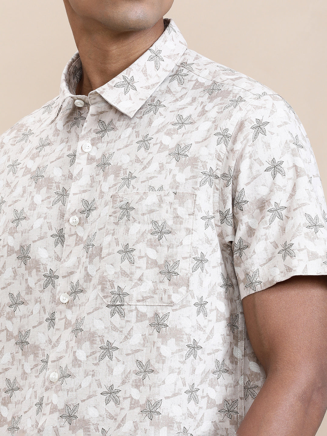 Linen Blend Abstract Dry Leaf Print Shirt Grey