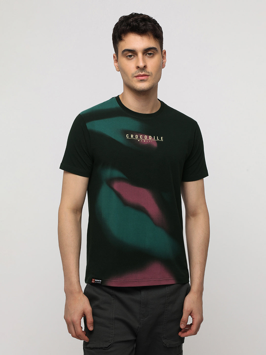 Blurry Print with Letter Graphic T-Shirt in Dark Green