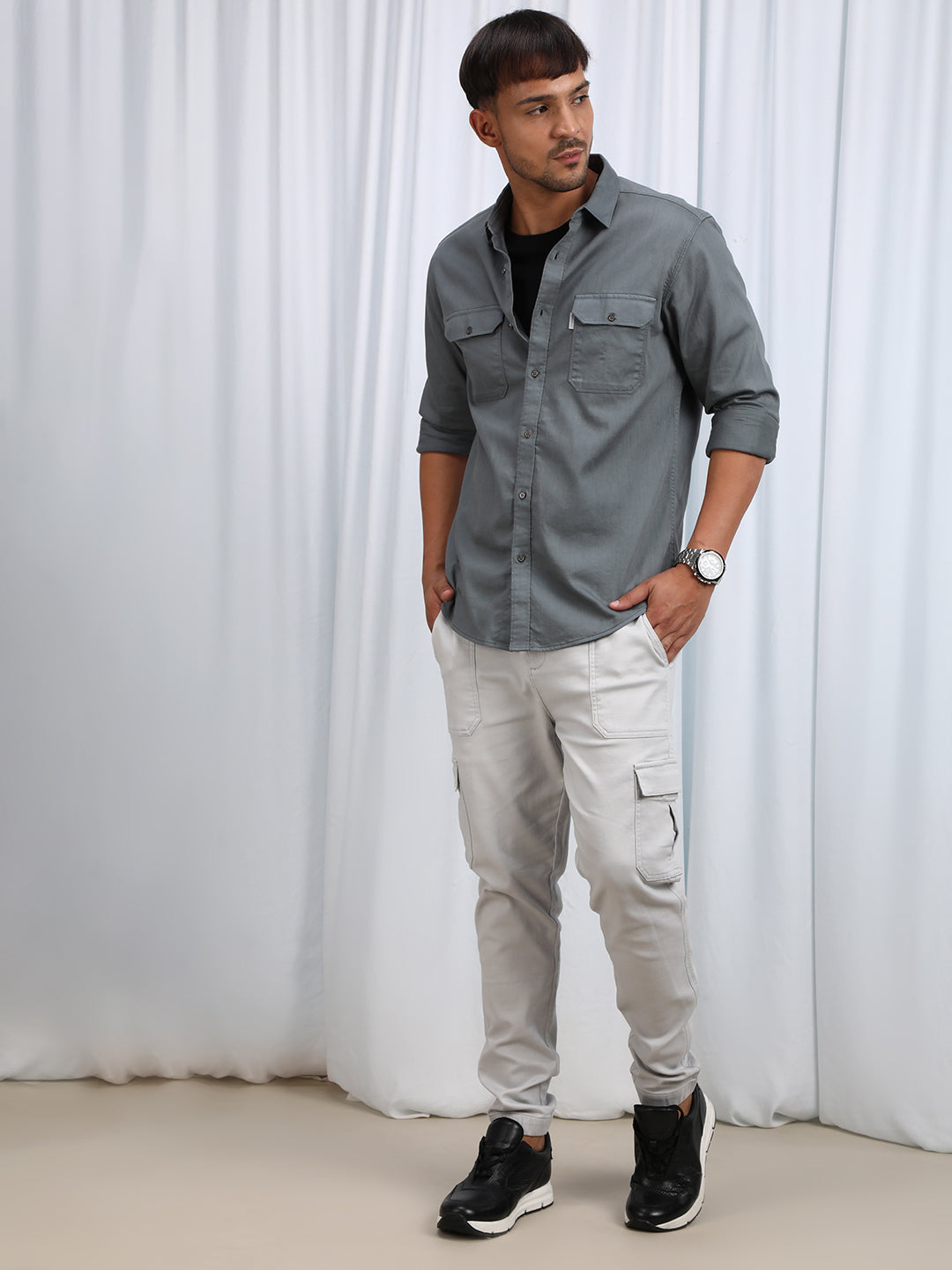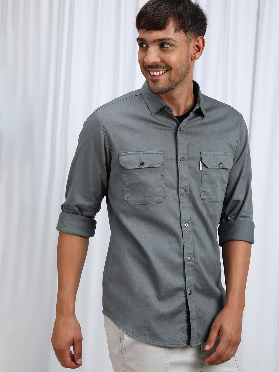 Grey Utility Style Cotton Textured Comfort Fit Shirts