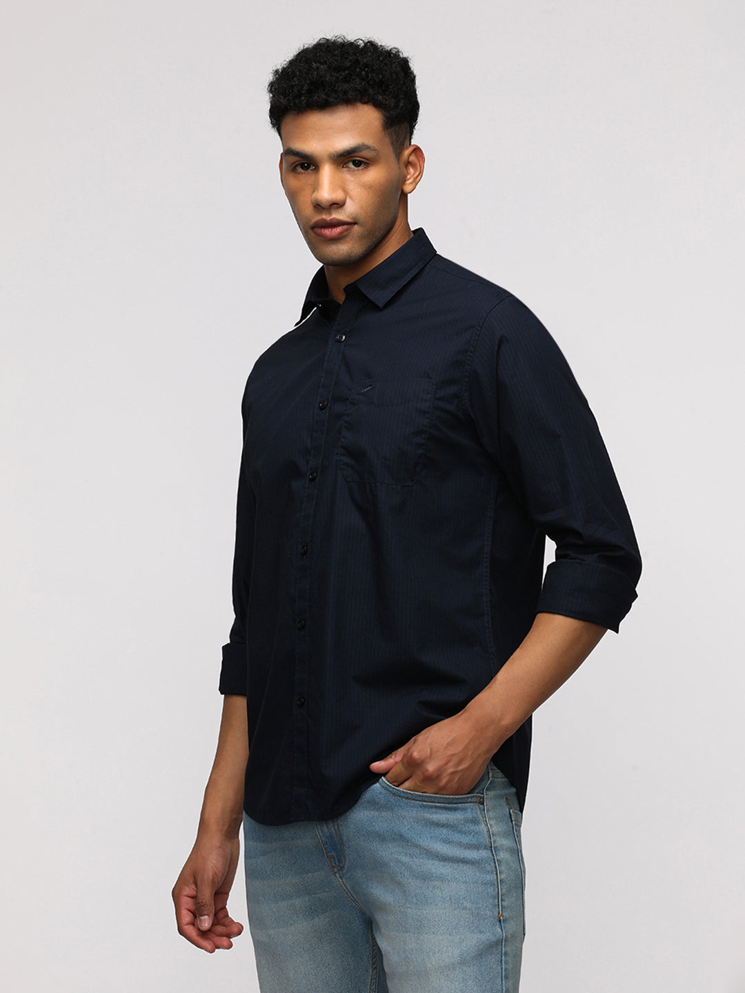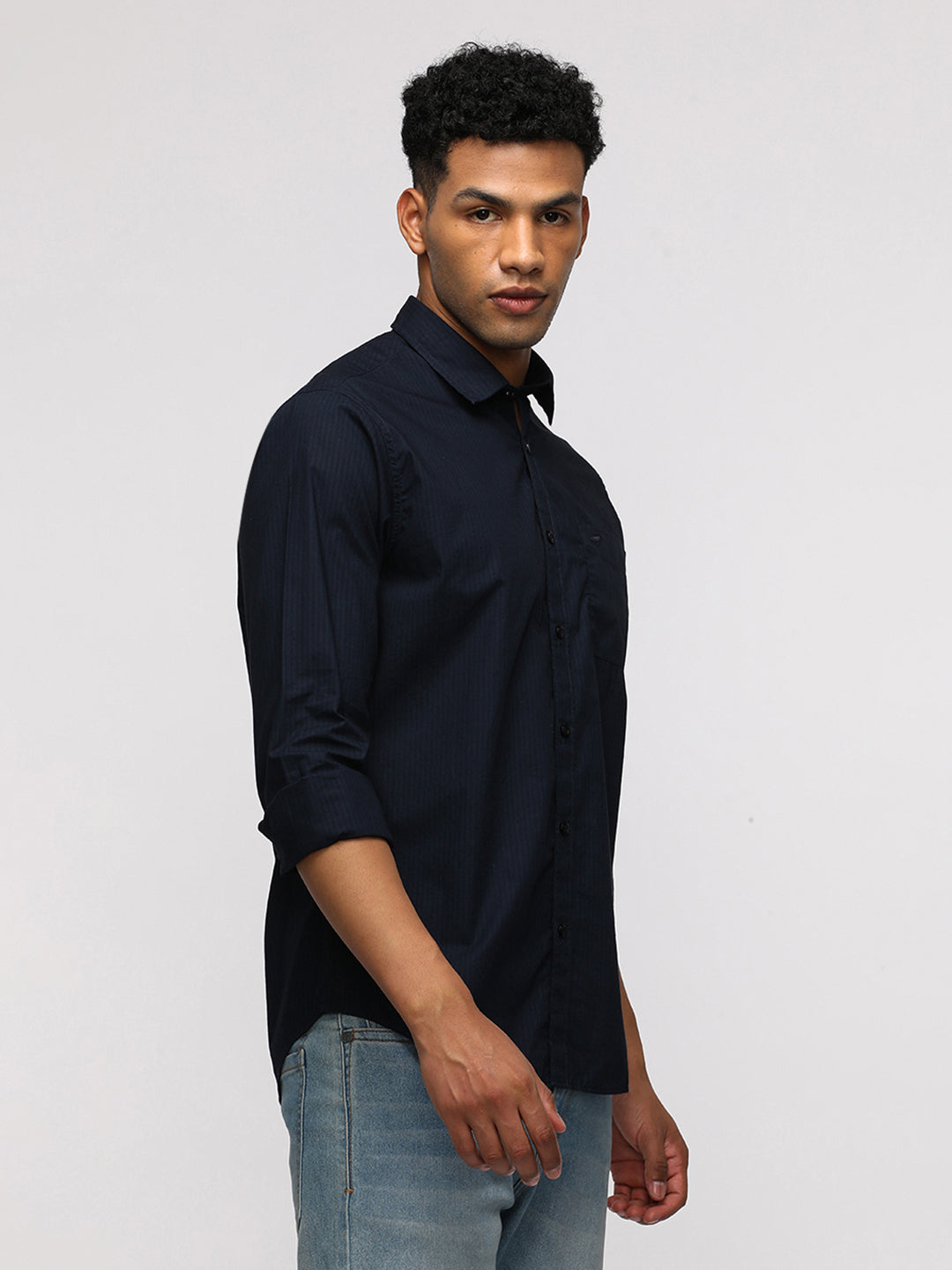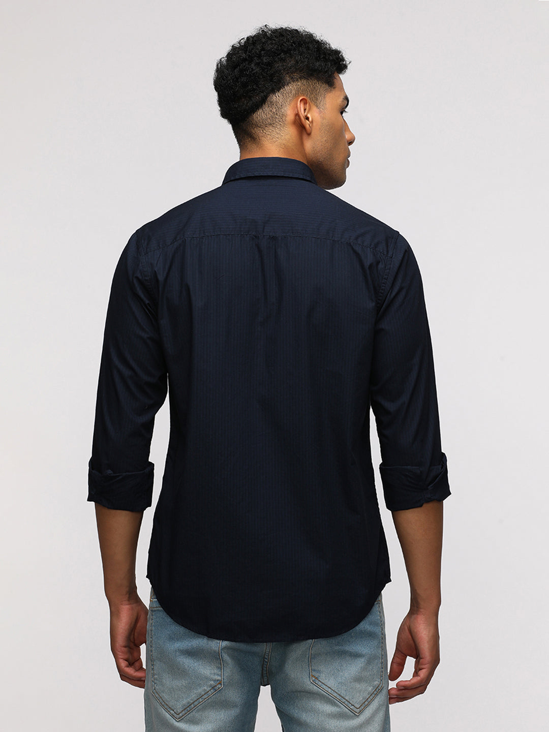 Navy Geometric Horizontal Self Stripe Cotton Viscose Fabric Comfort Fit Shirts