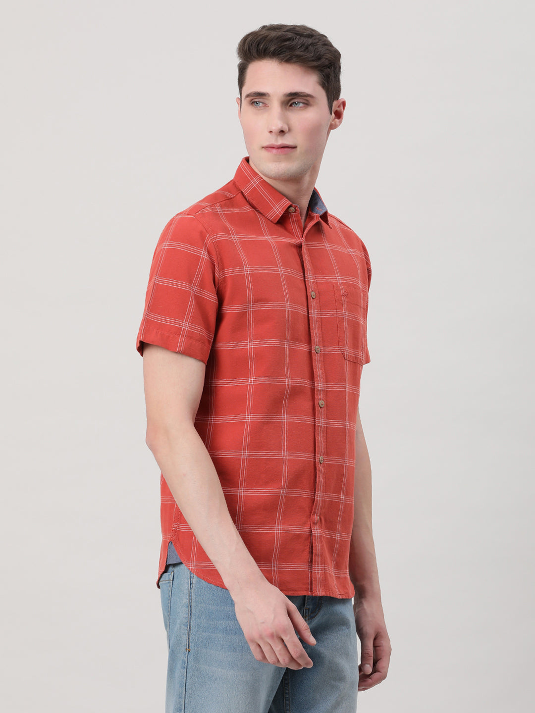 Brick Red Checked Half Sleeve 100% Cotton Shirt