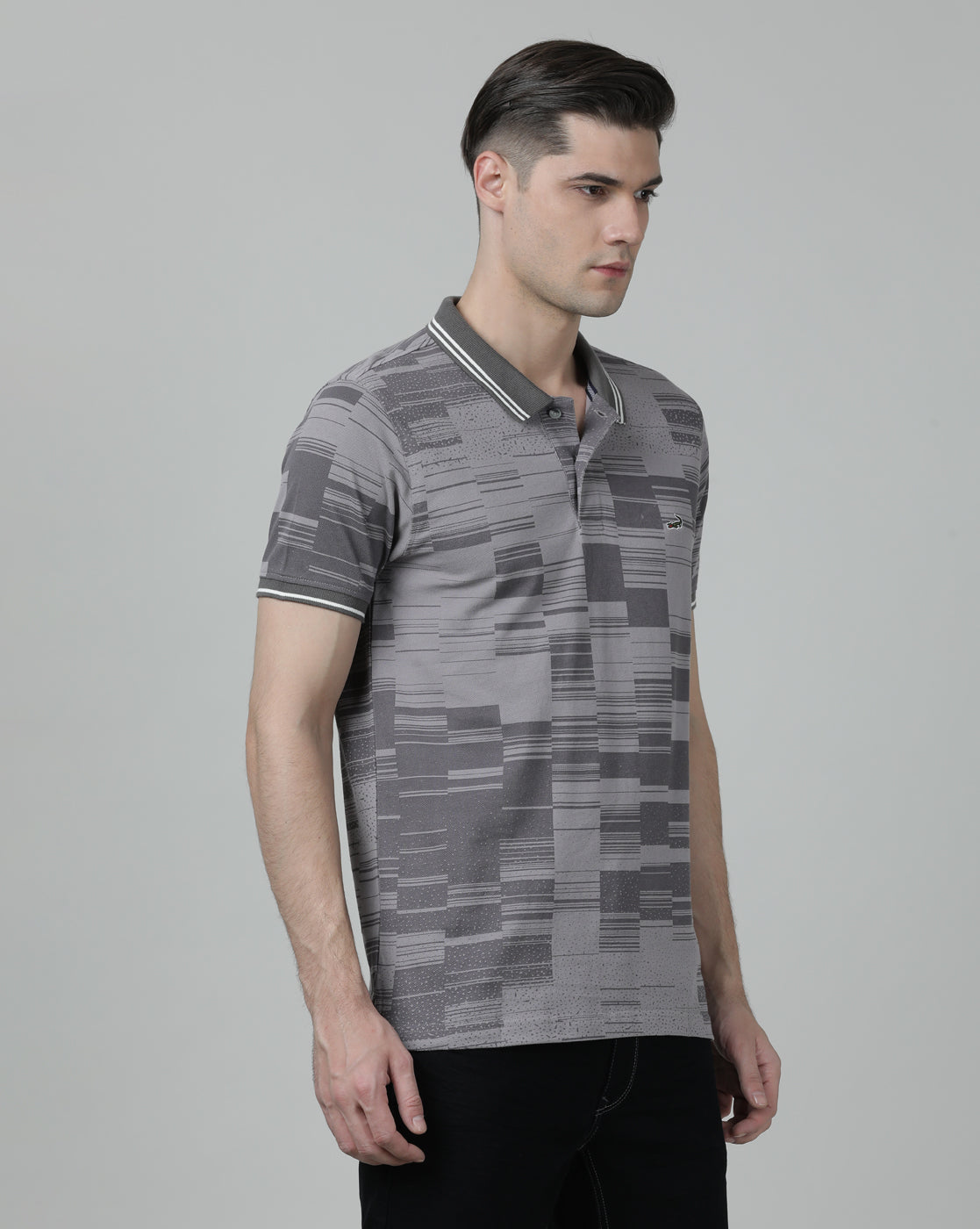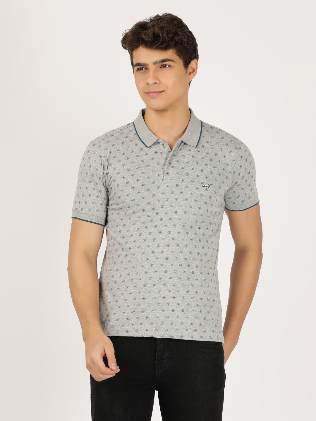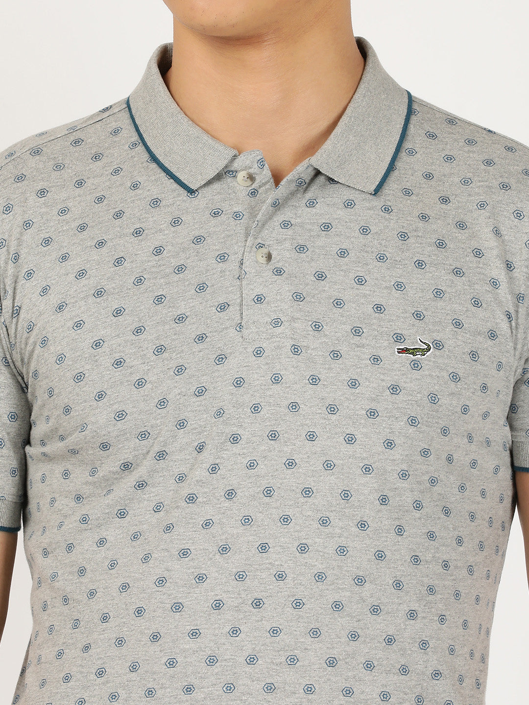 Grey Printed Casual Polo T-Shirt