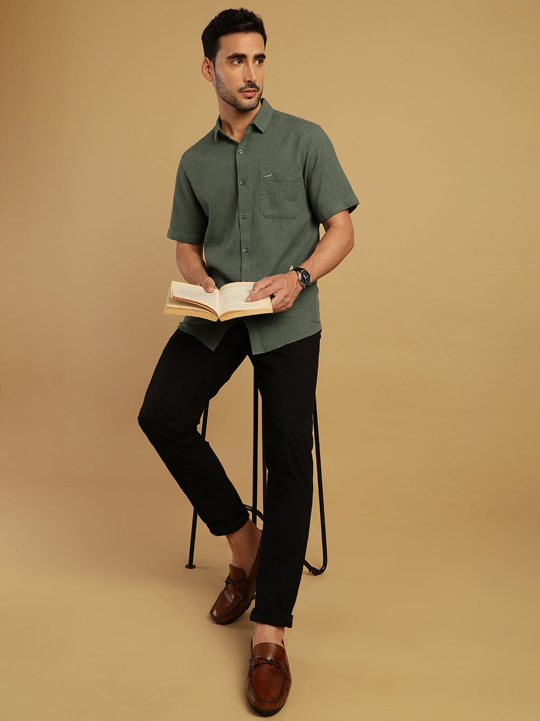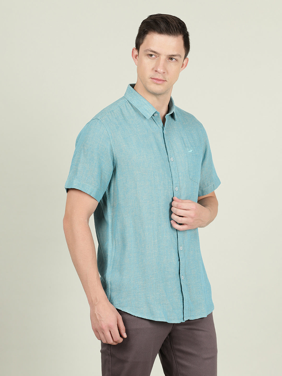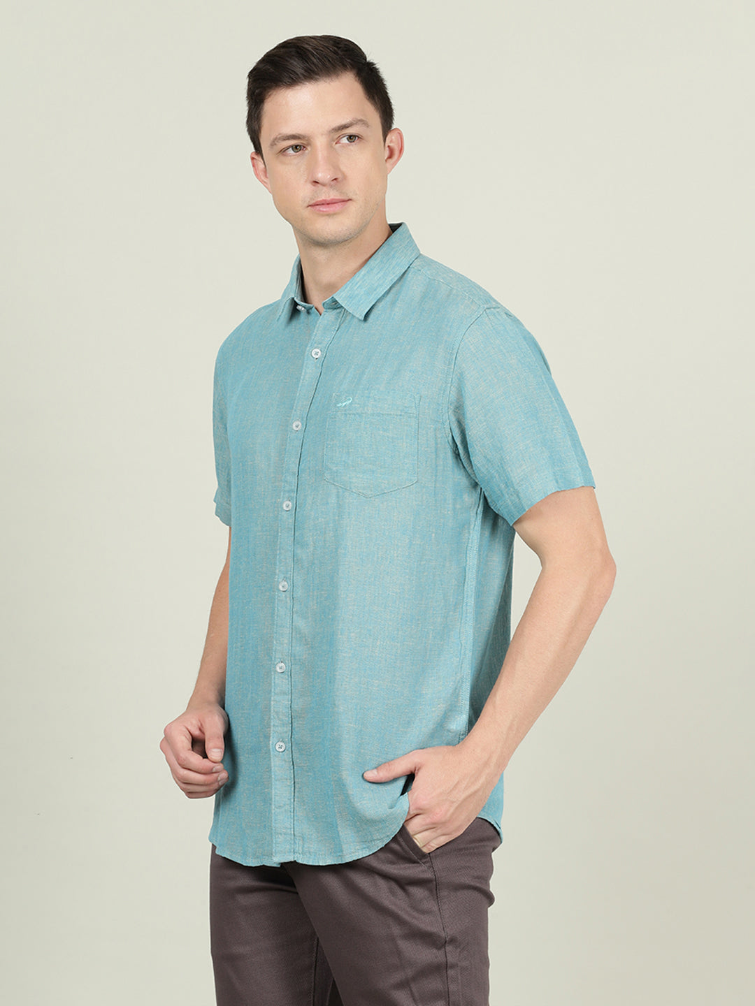 Green Solid Half Sleeve Linen Shirt
