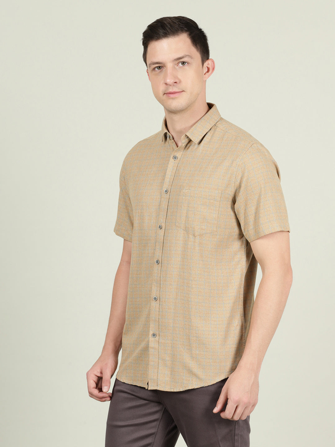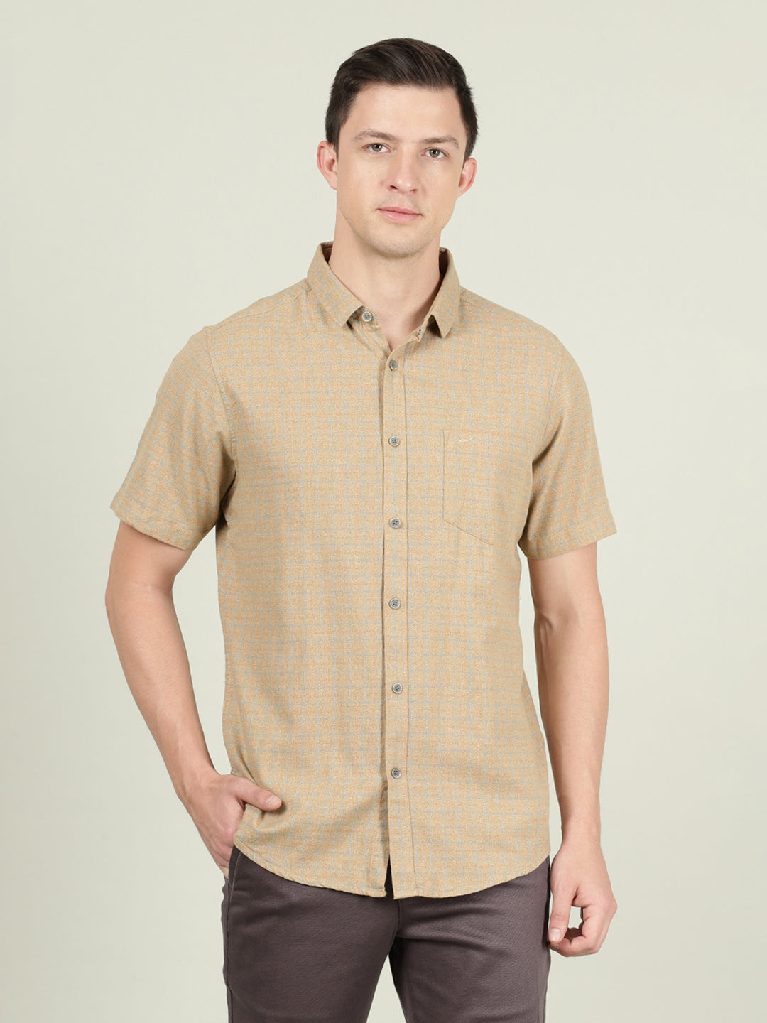 Khaki Brown Checked Half Sleeve 100% Cotton Shirt