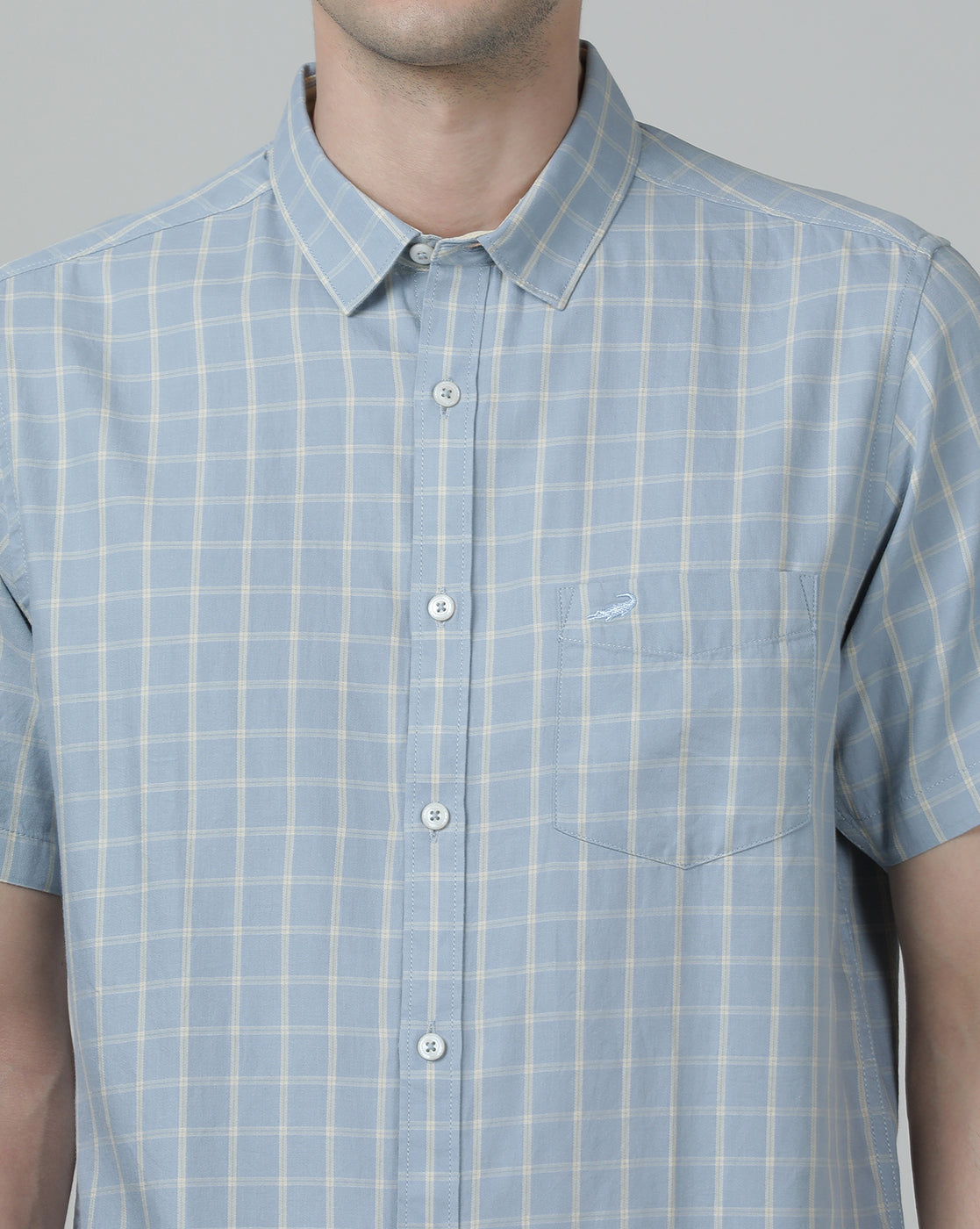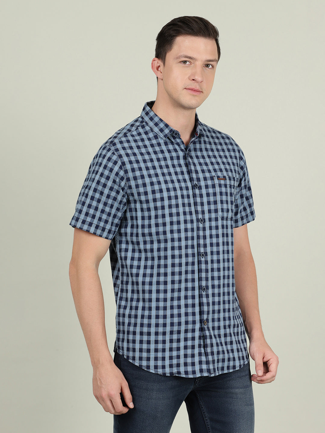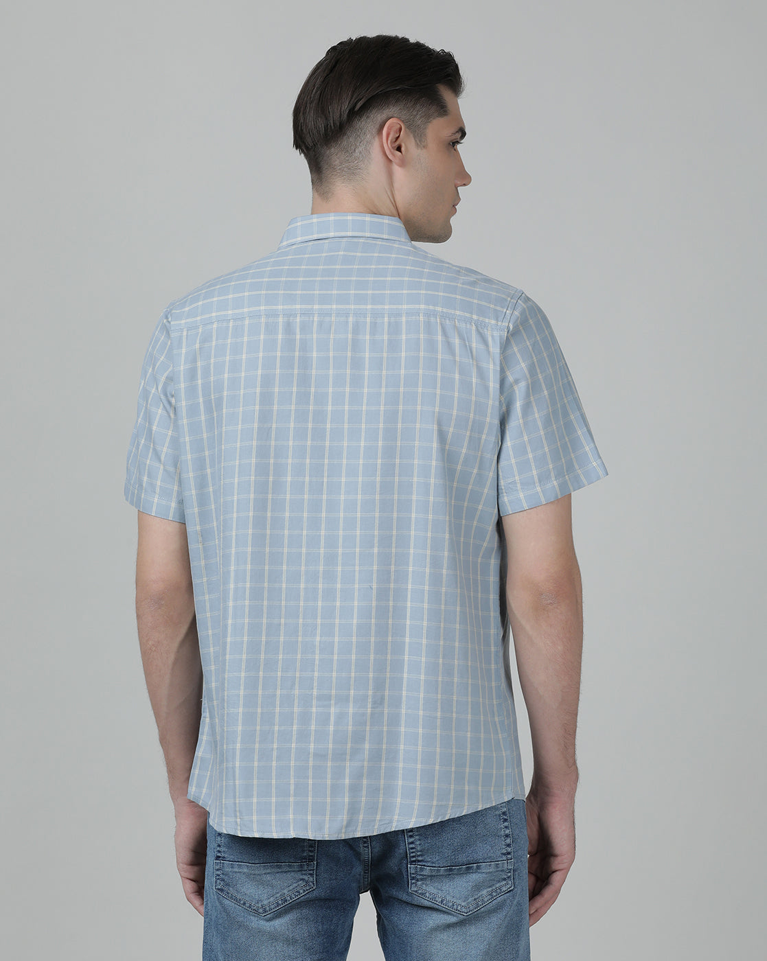 Light Blue Checked Half Sleeve 100% Cotton Casual Shirt