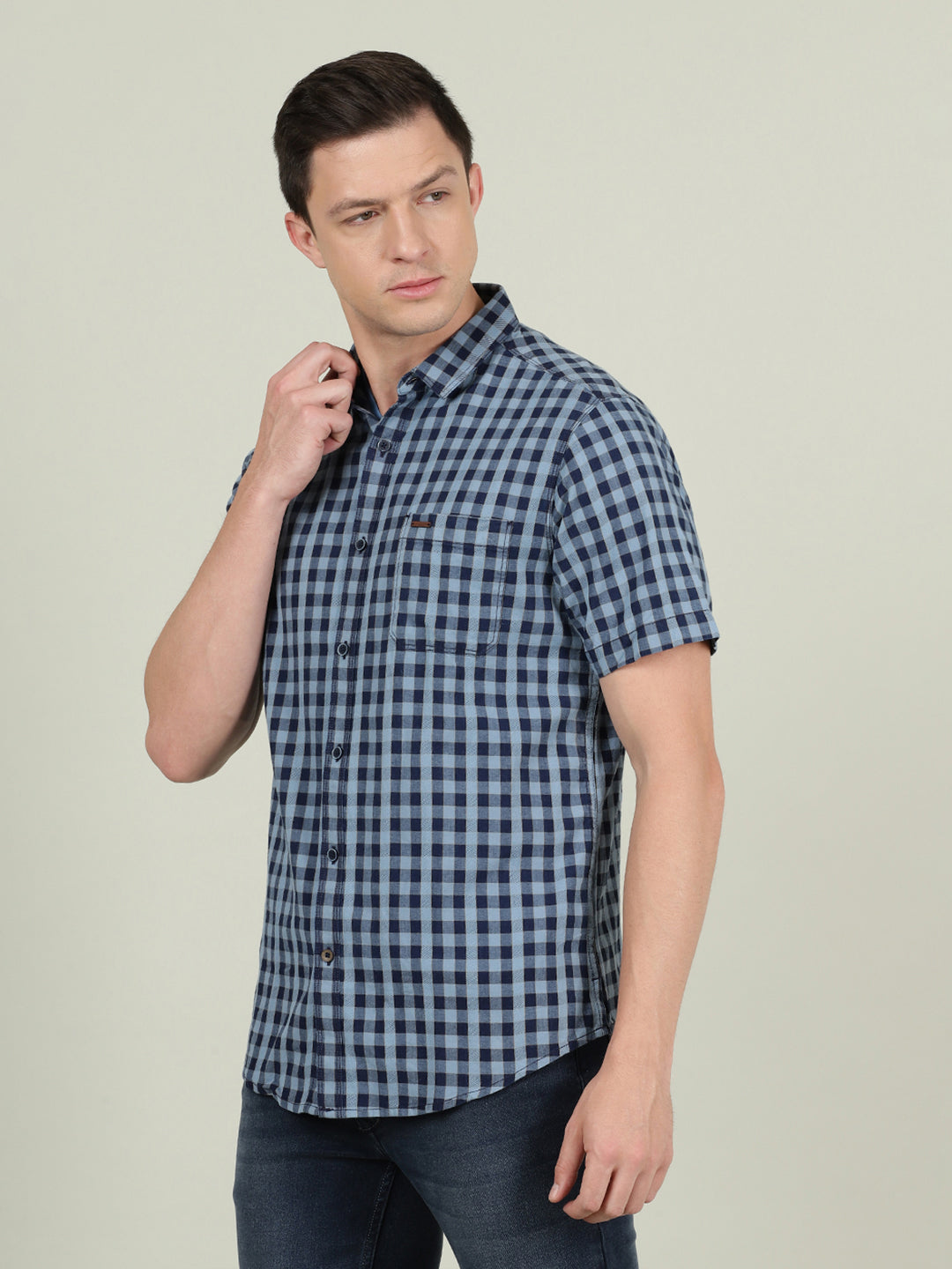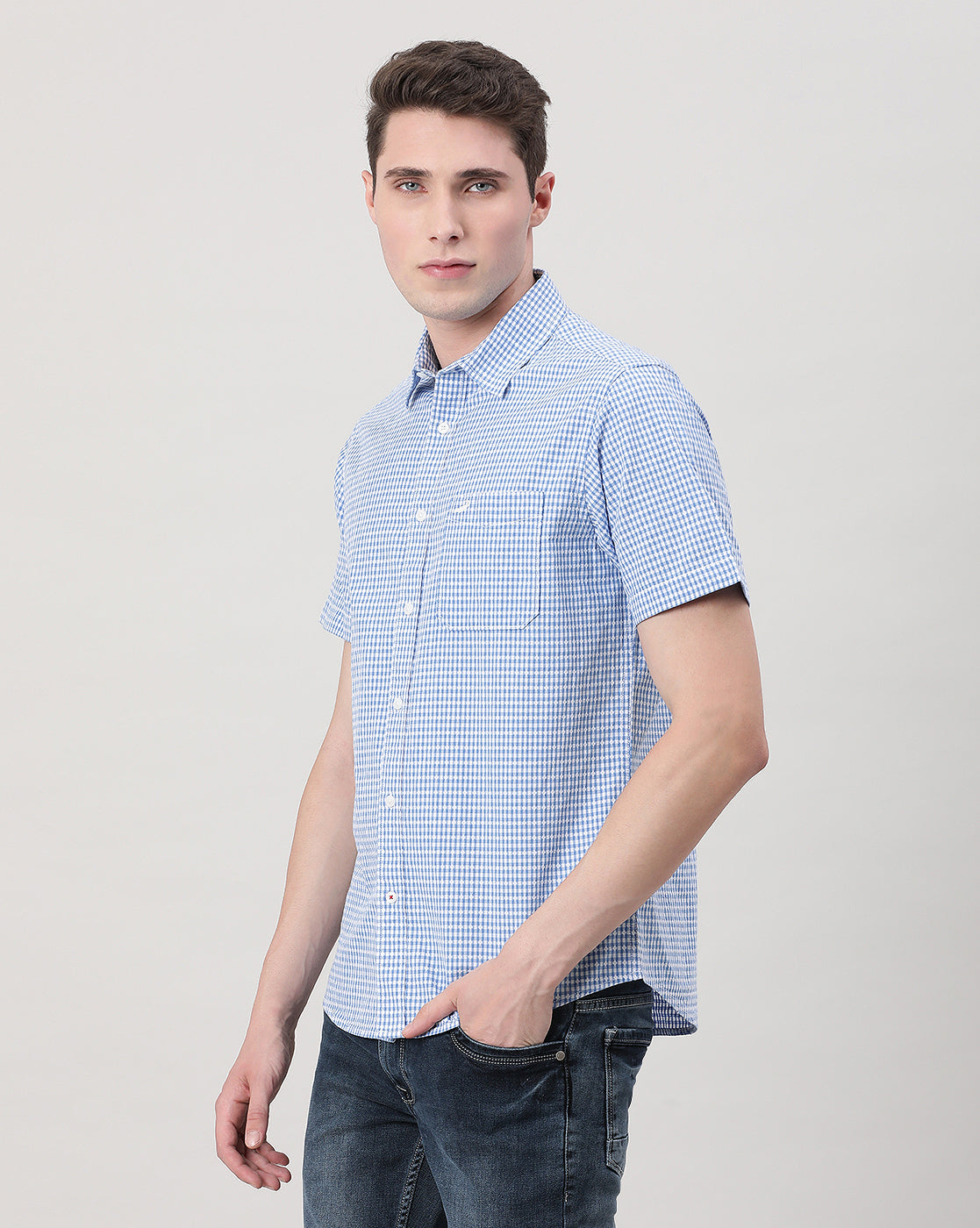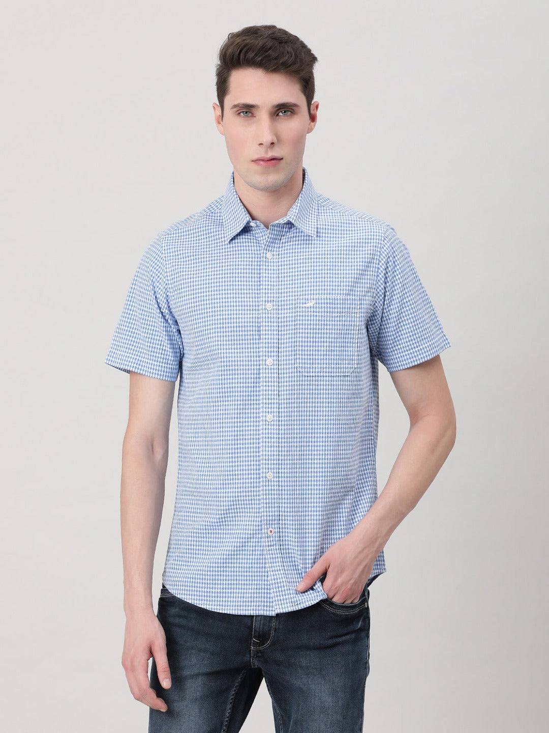 Light Blue Checked Half Sleeve 100% Cotton Casual Shirt