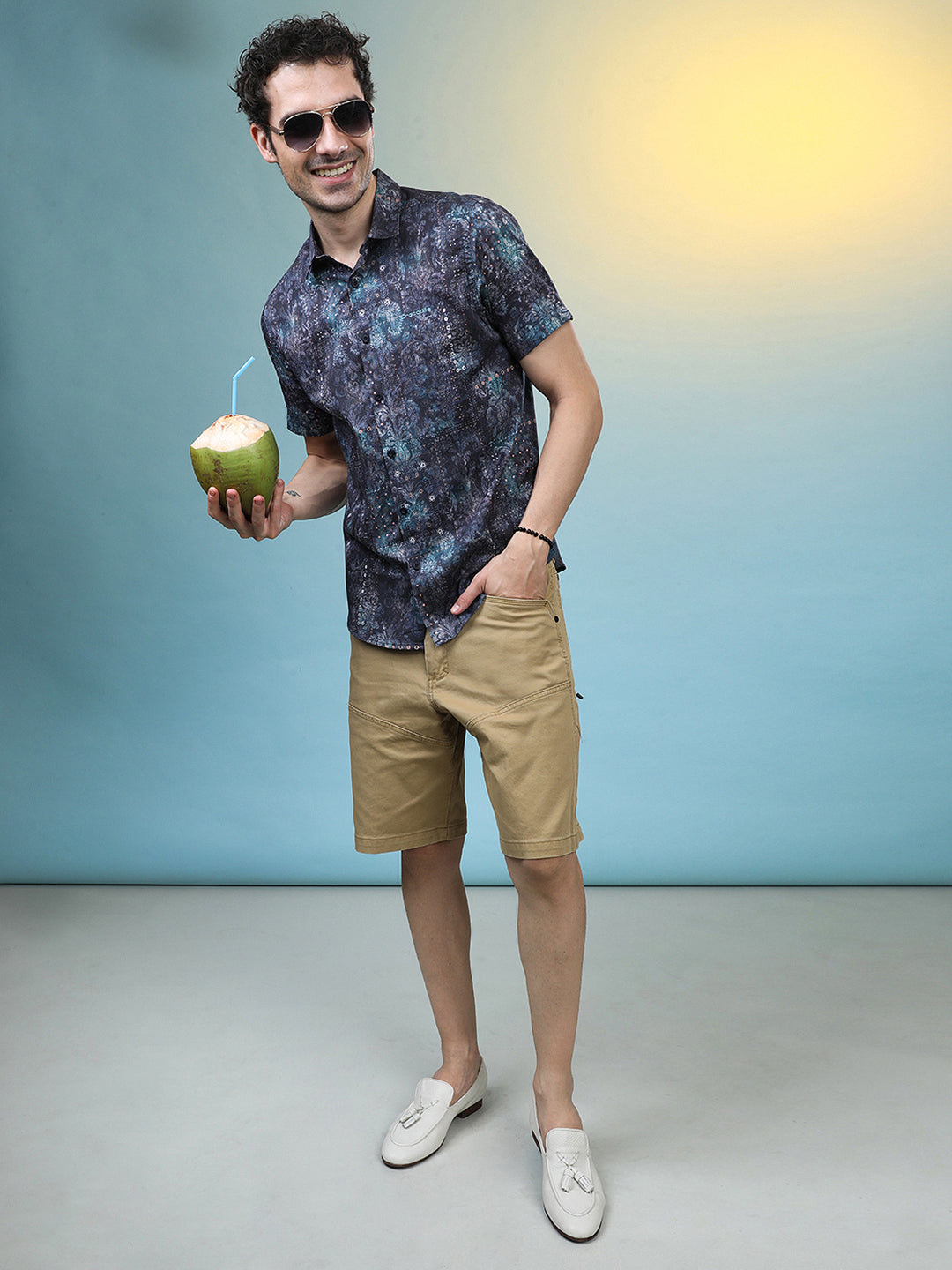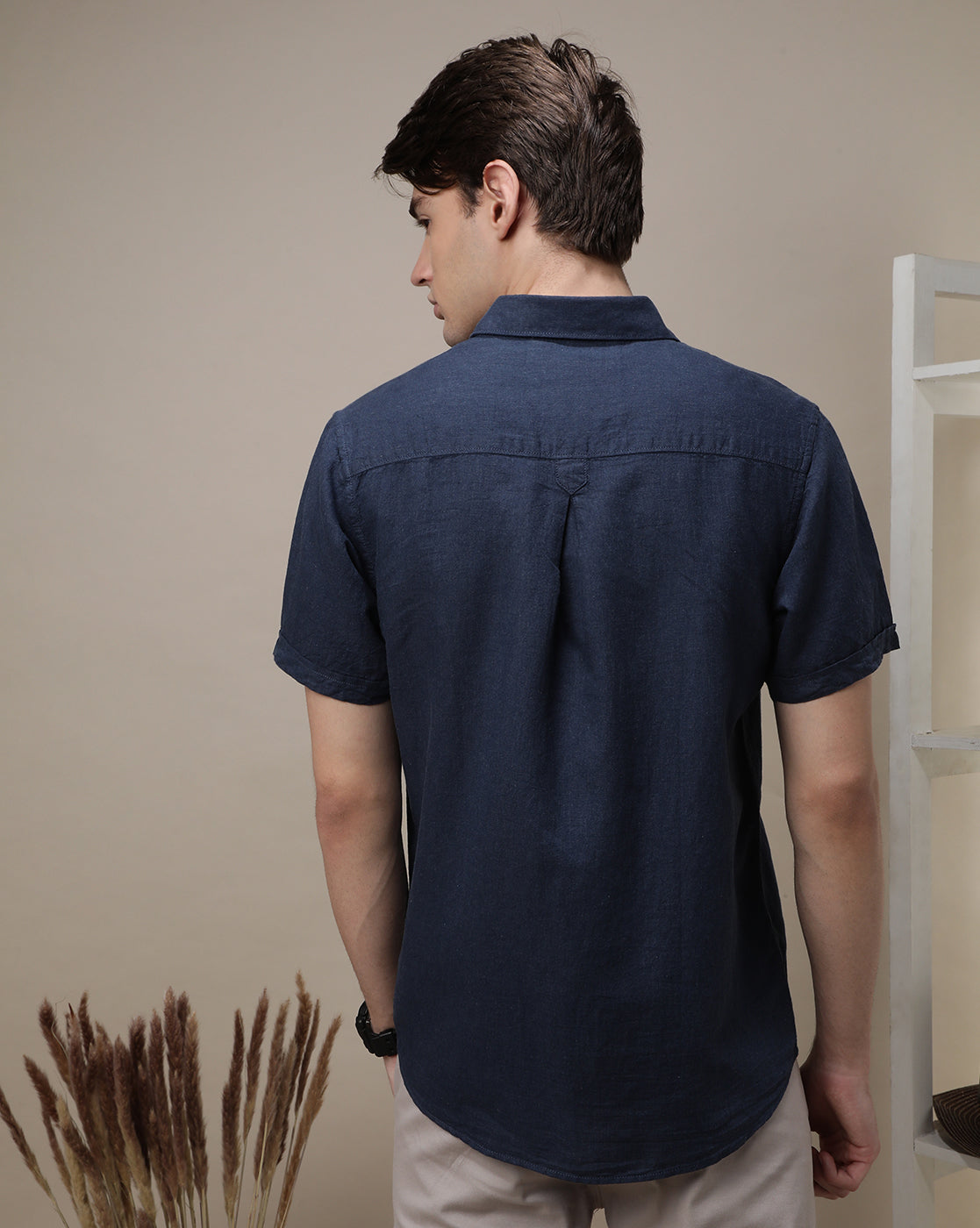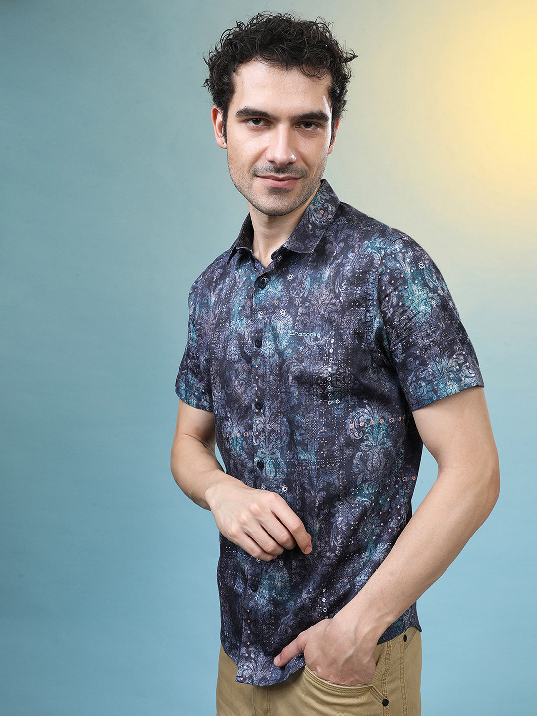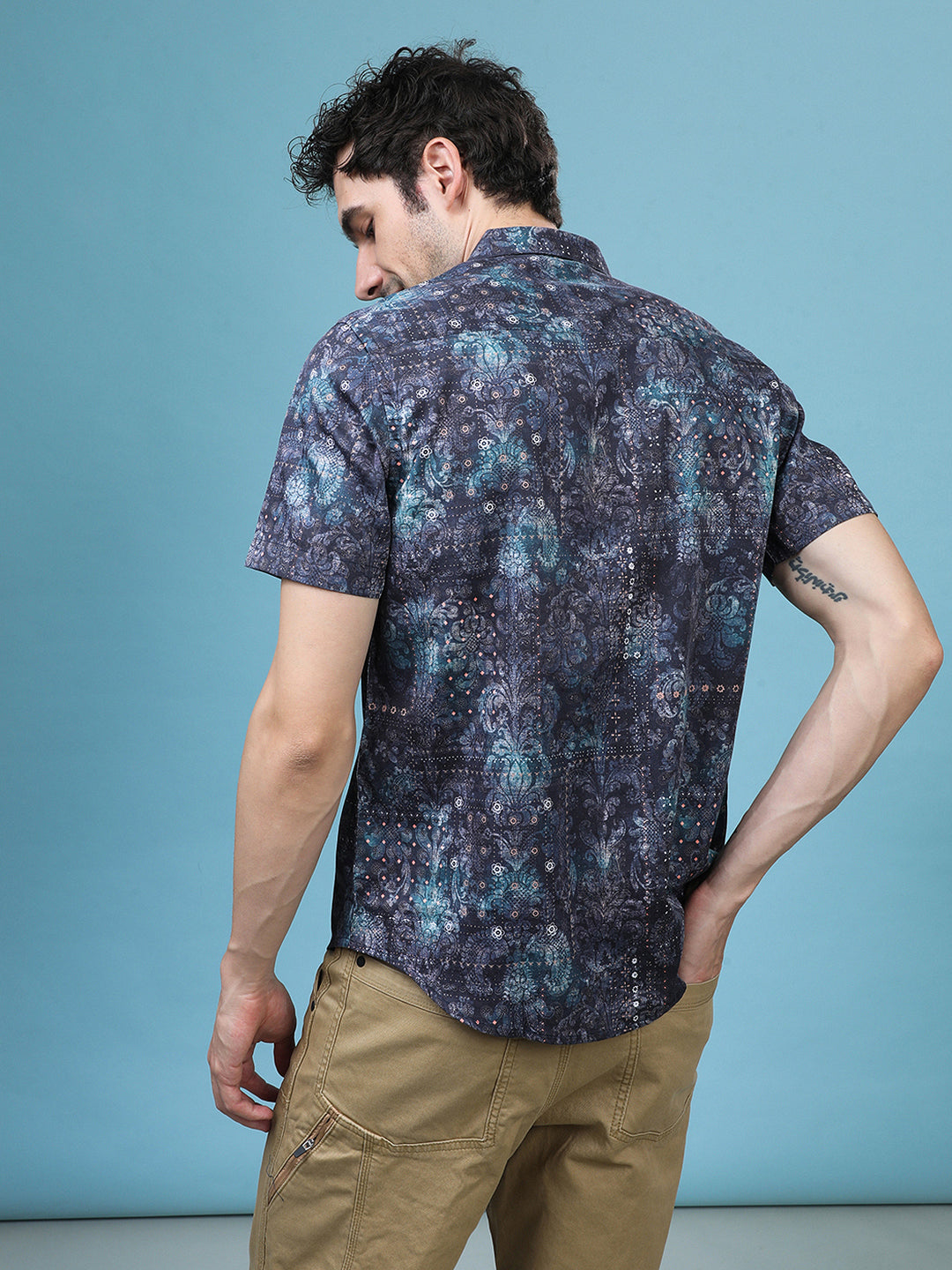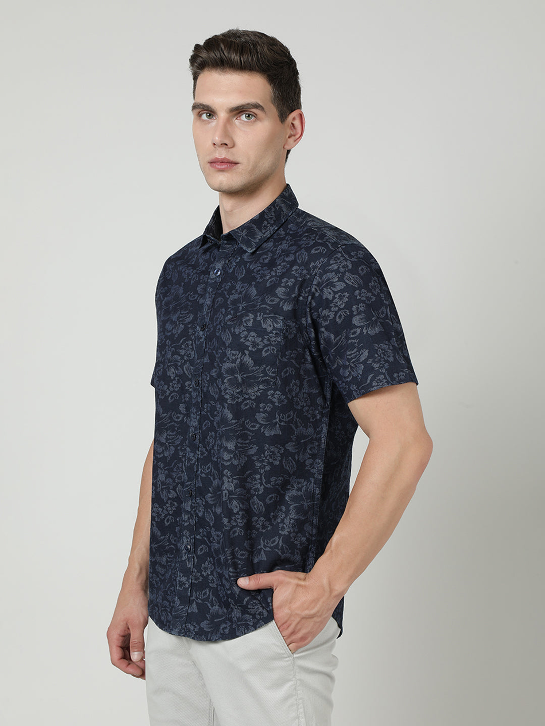 Navy Printed Half Sleeve Casual 100% Cotton Shirt