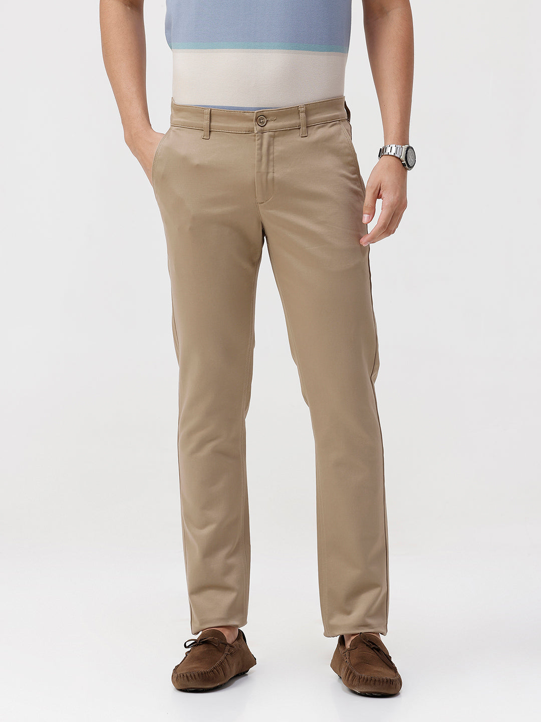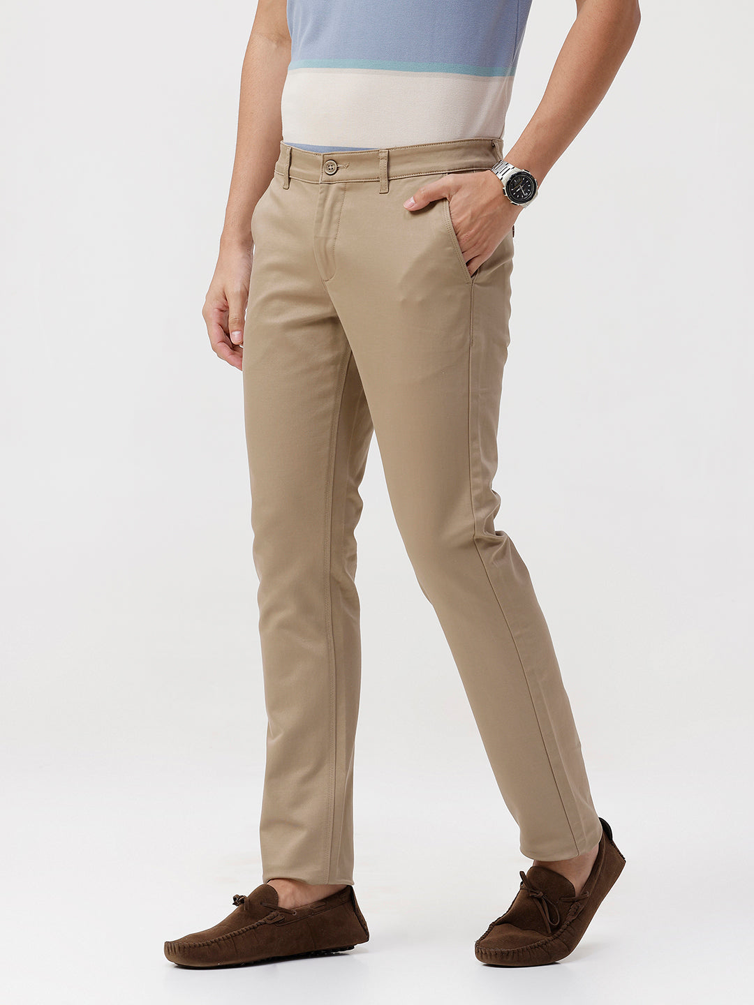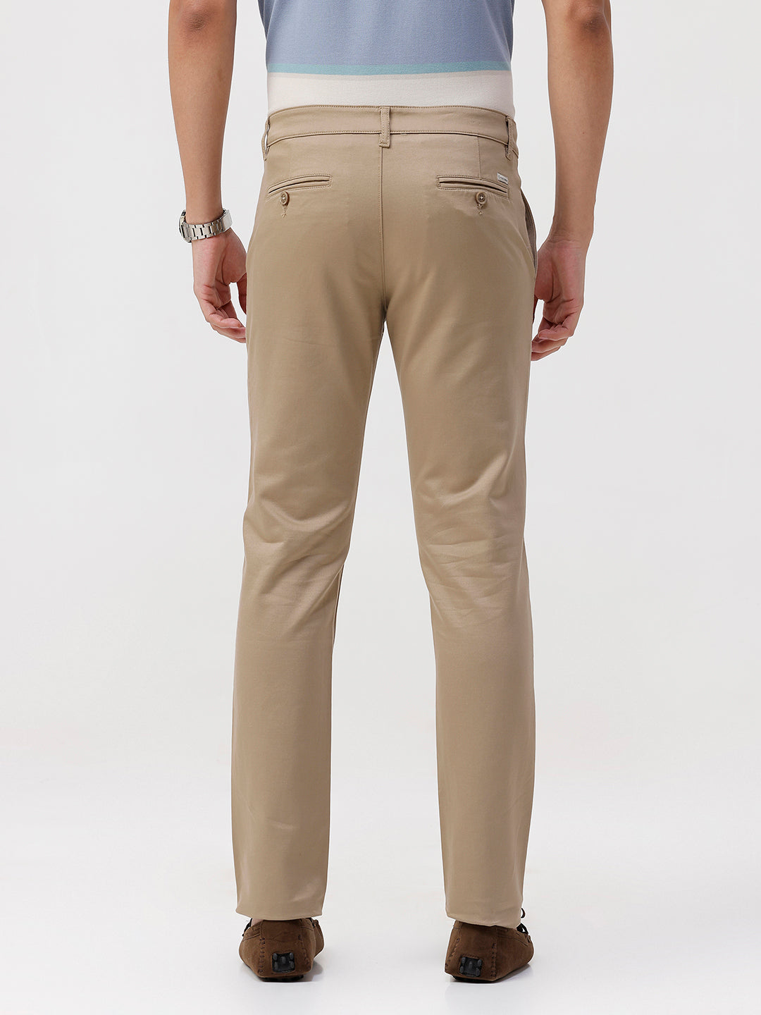 Beige Classic Chambray Fabric Tri-Blend Stitch Detailings Slim Fit Trousers
