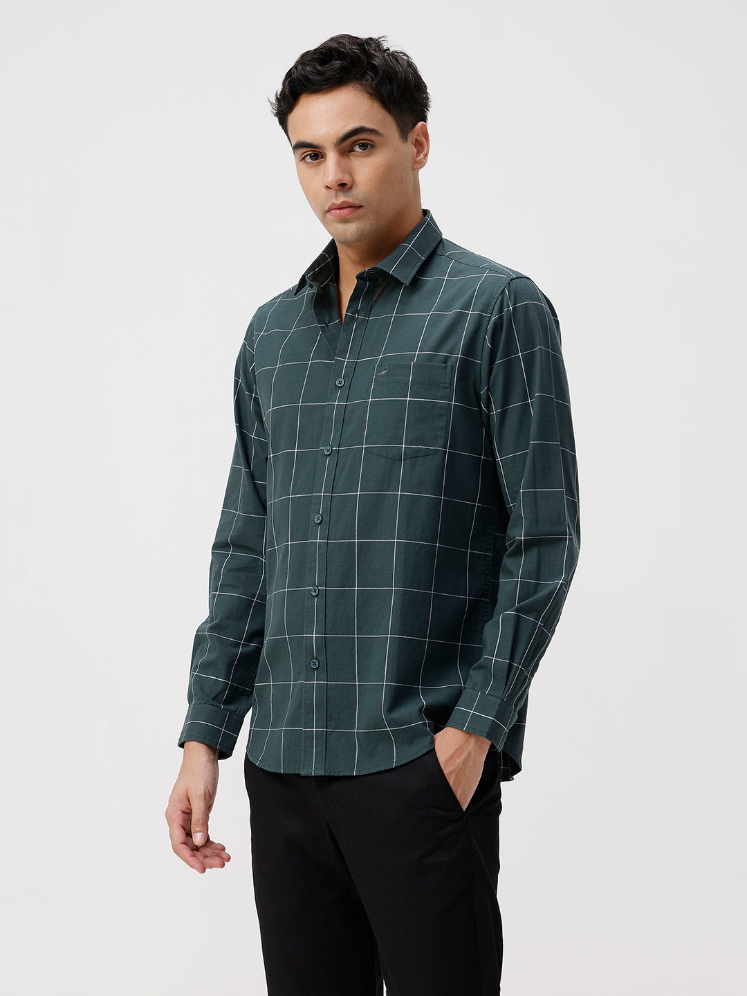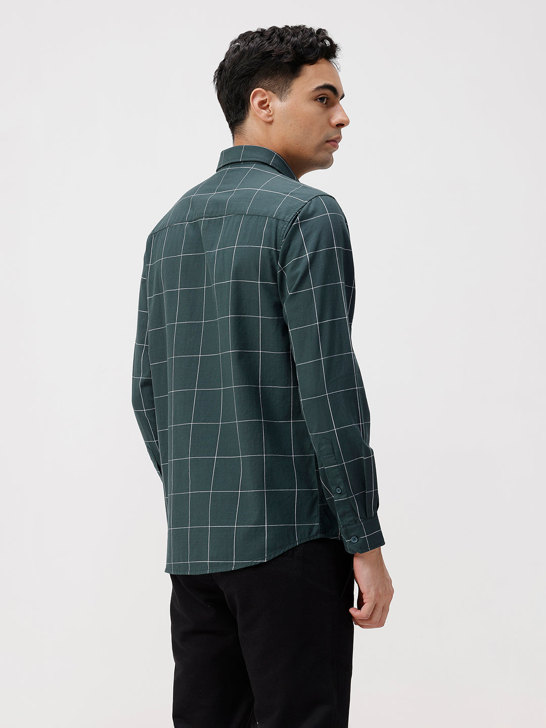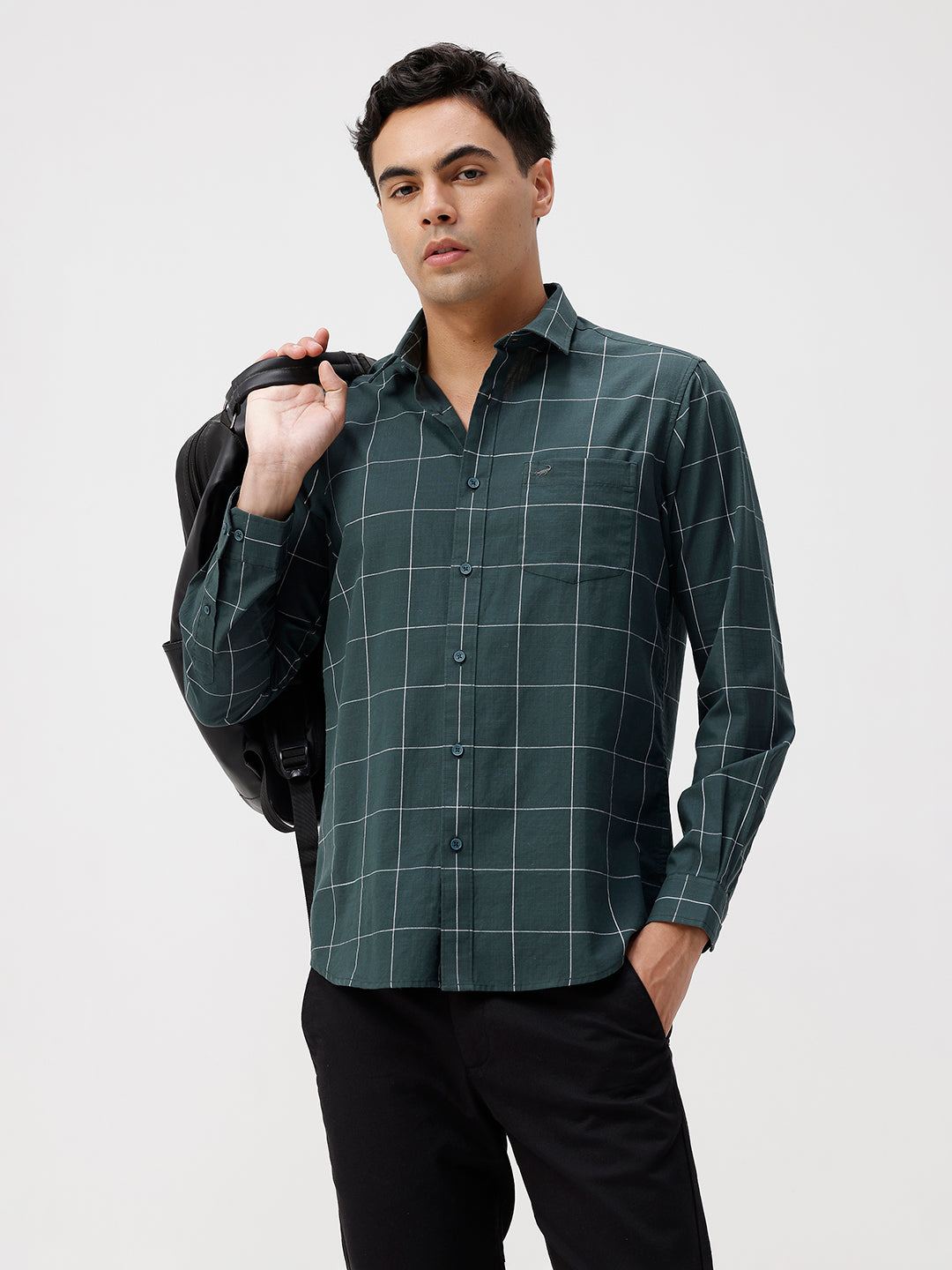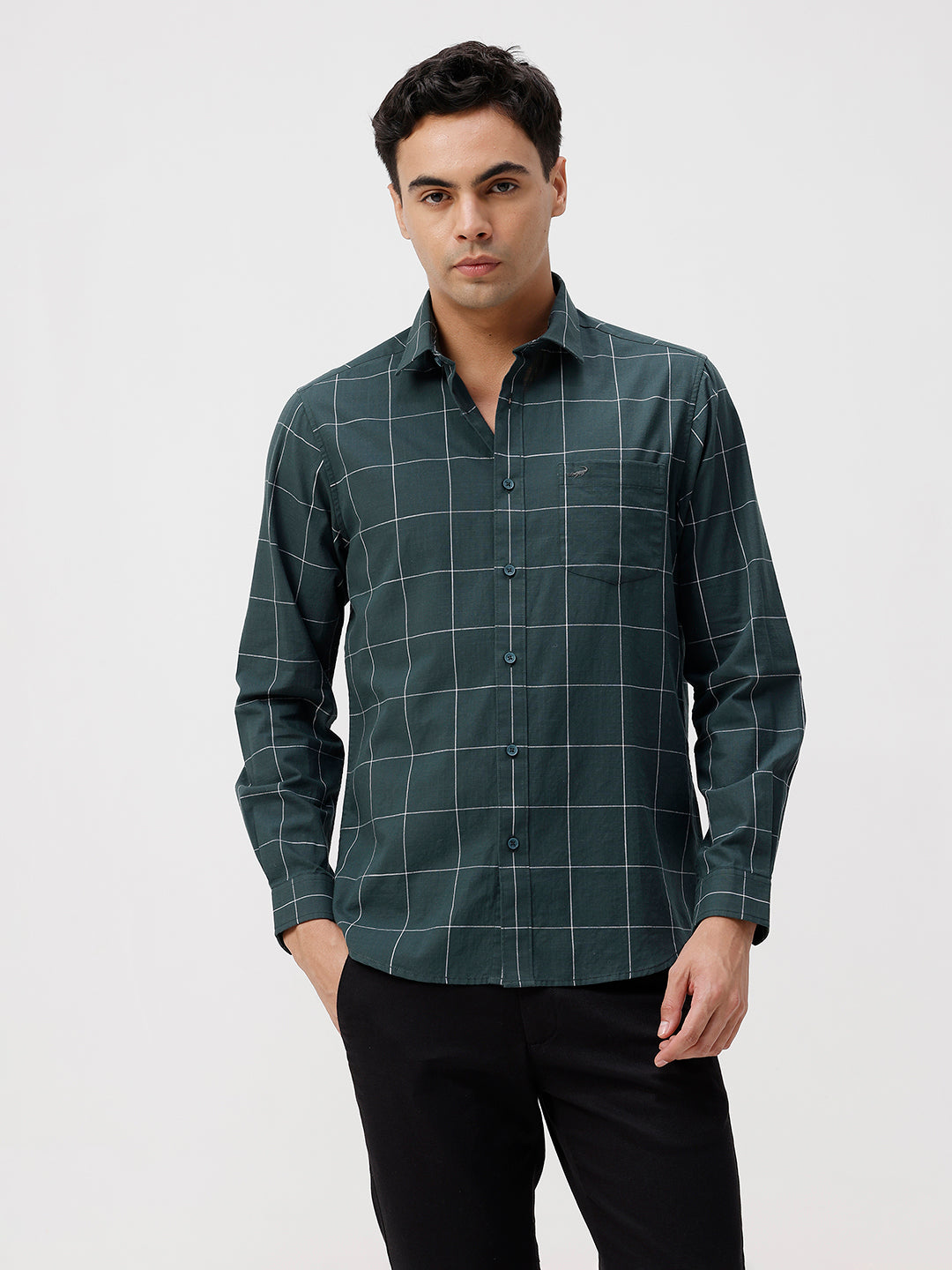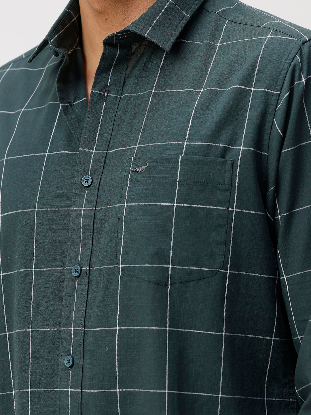 Green Self Emboss Checks Cotton V-Shape Pocket Comfort Fit Shirts