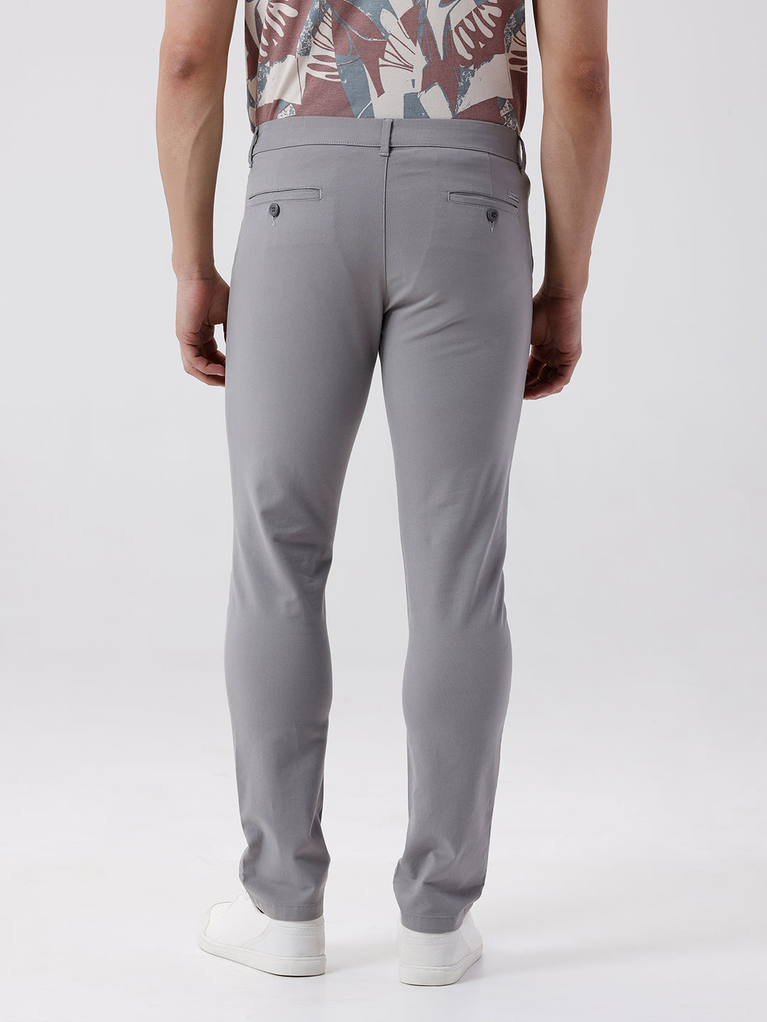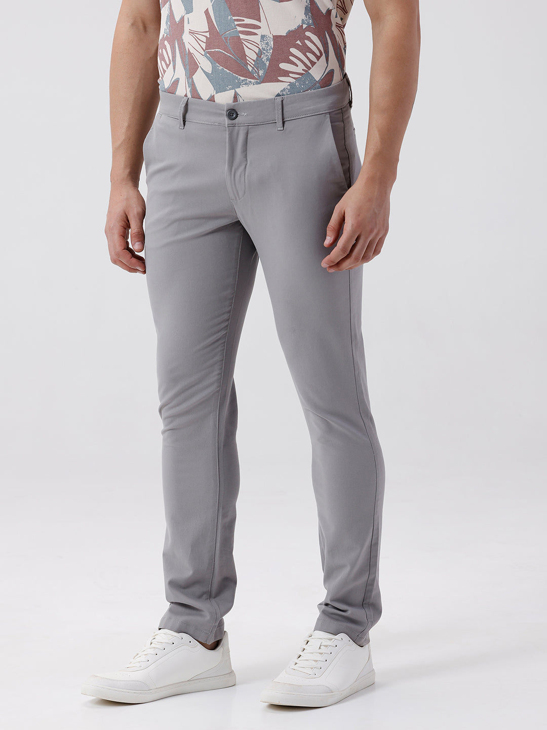 This trouser is made for everyday comfort. It has a slim fit silhouette. It carries a solid look. The colour is grey. Key detail 98% cotton 2% elastane
