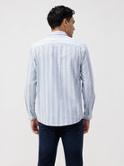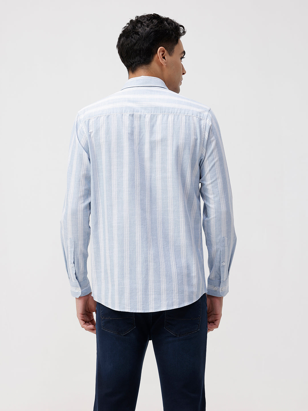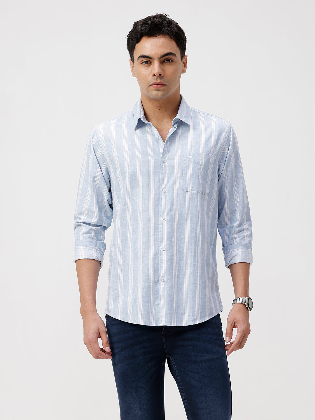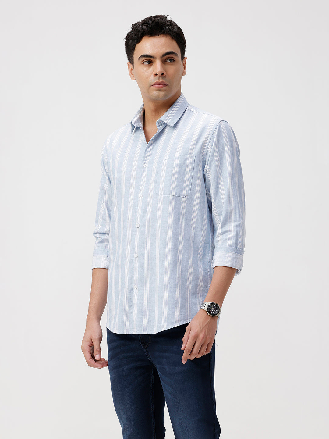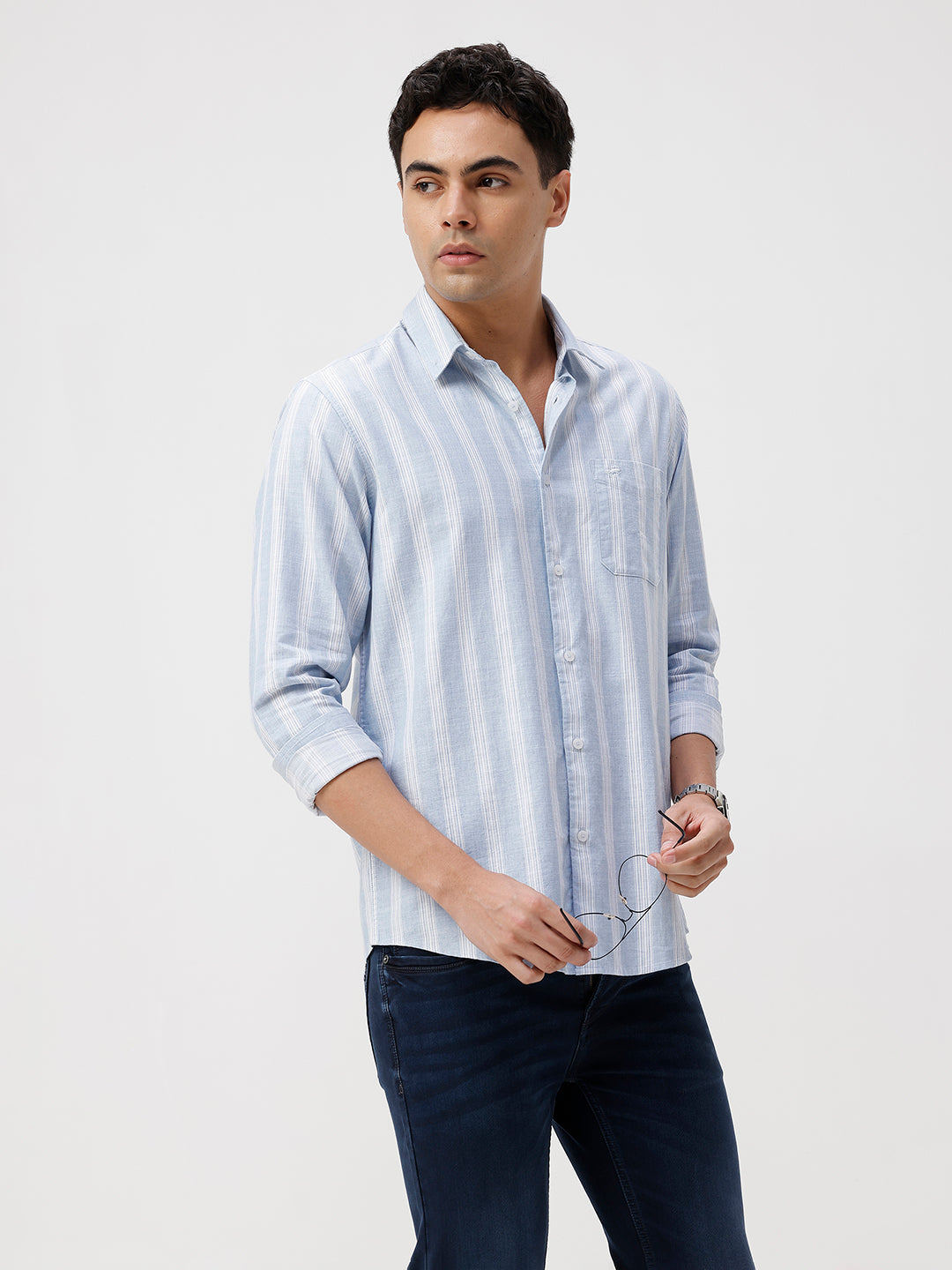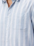 Men’s lightweight sky blue striped cotton shirt with herringbone texture for summer comfort.