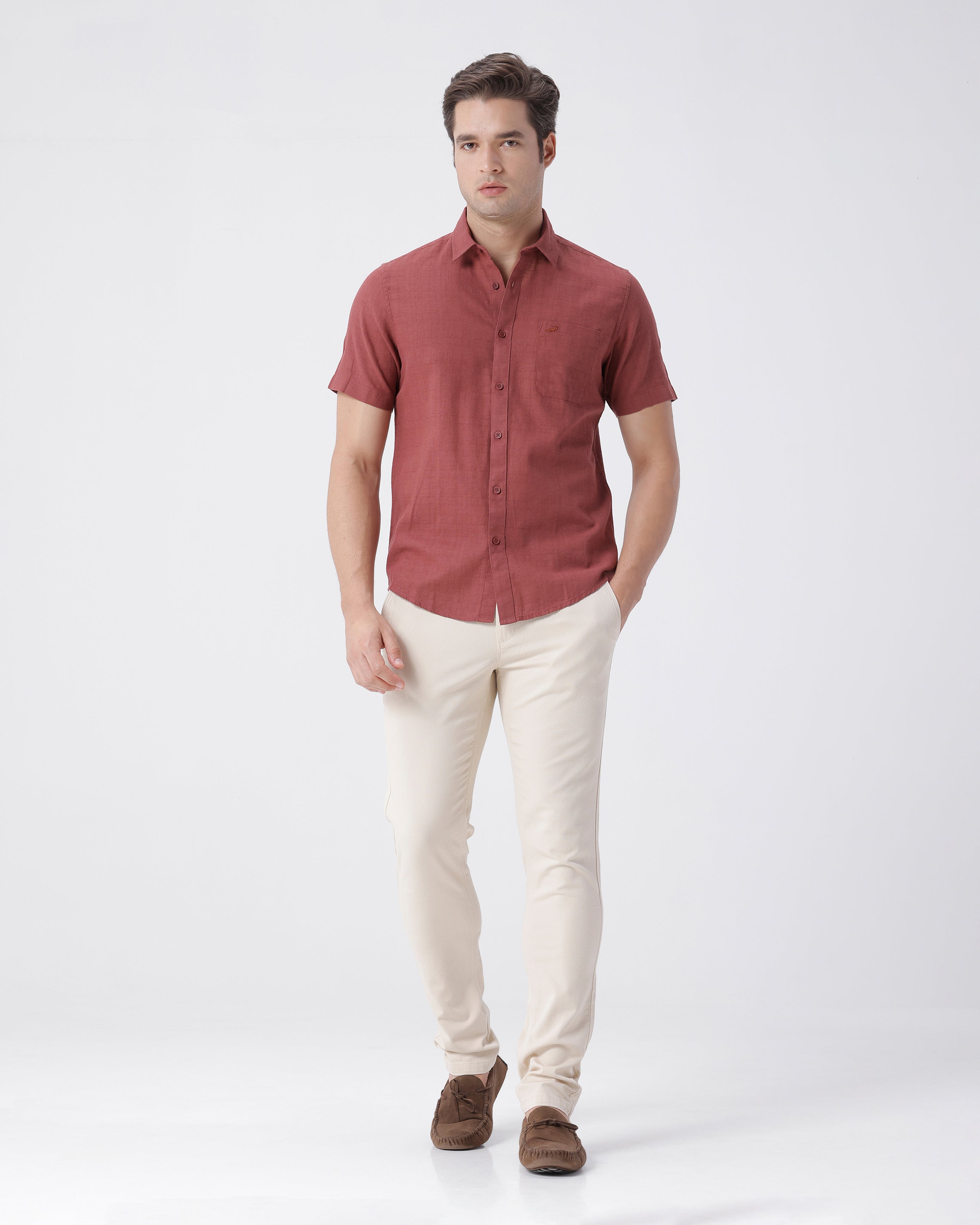 Formal Pairing with Tailored Trousers or Chinos: Crocodile's full sleeve best casual shirts for men effortlessly transition from casual to semi-formal with the right pairings. Combine these shirts with tailored trousers or chinos for a refined, office-ready appearance. The sleekness of the shirt's design, whether solid or check prints, complements the structured silhouette of tailored bottoms. This ensemble is an excellent choice for professional settings, business meetings, or semi-formal events where a sophisticated yet comfortable look is essential.