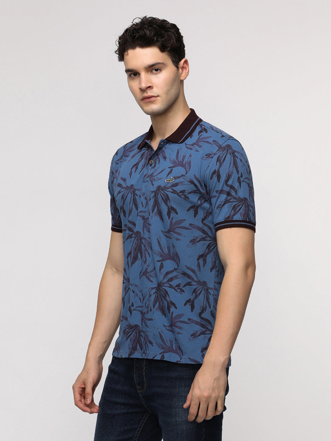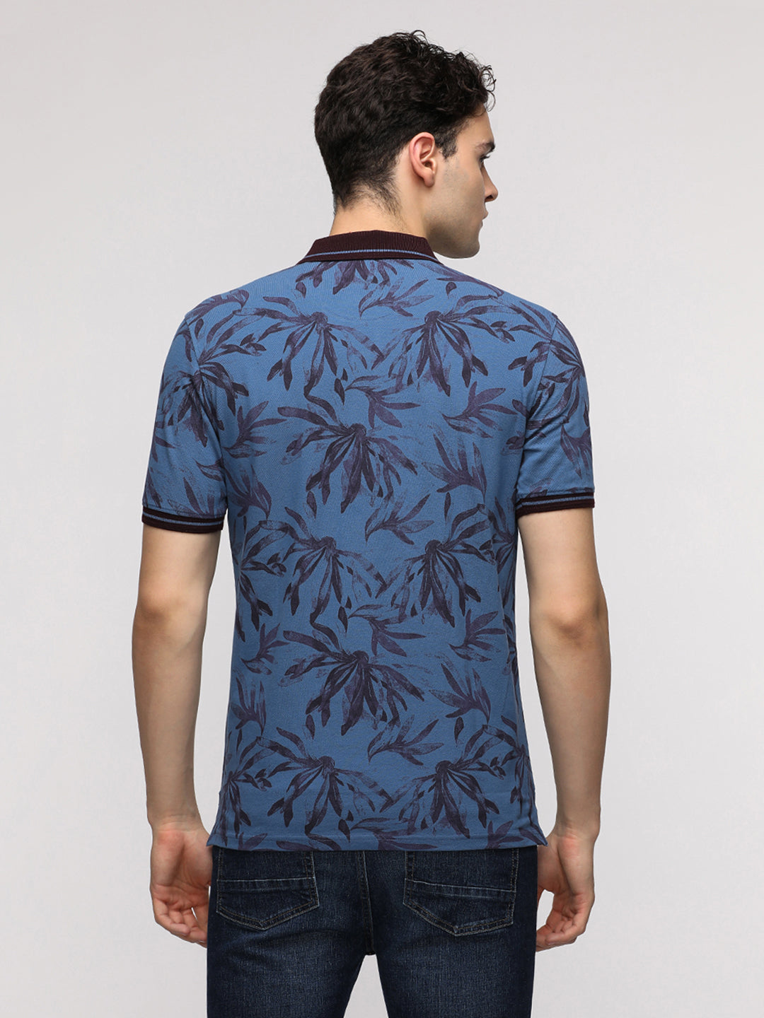 Abstract Tropical Leaf Printed Polo T-Shirt in Blue