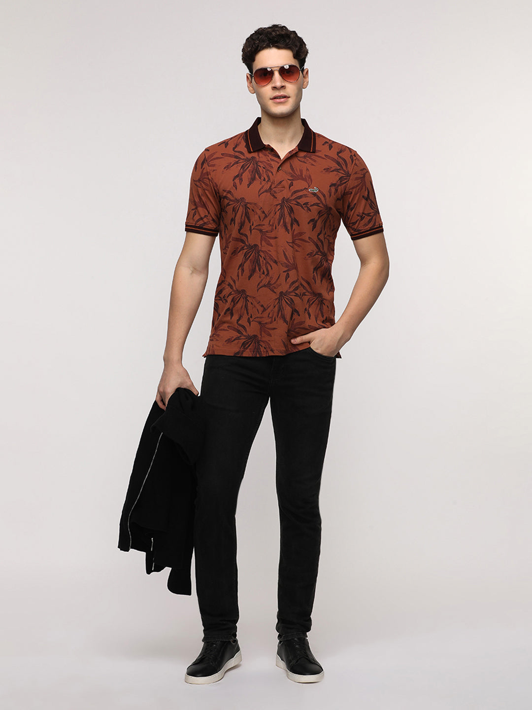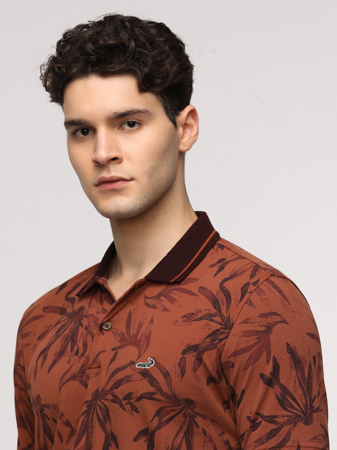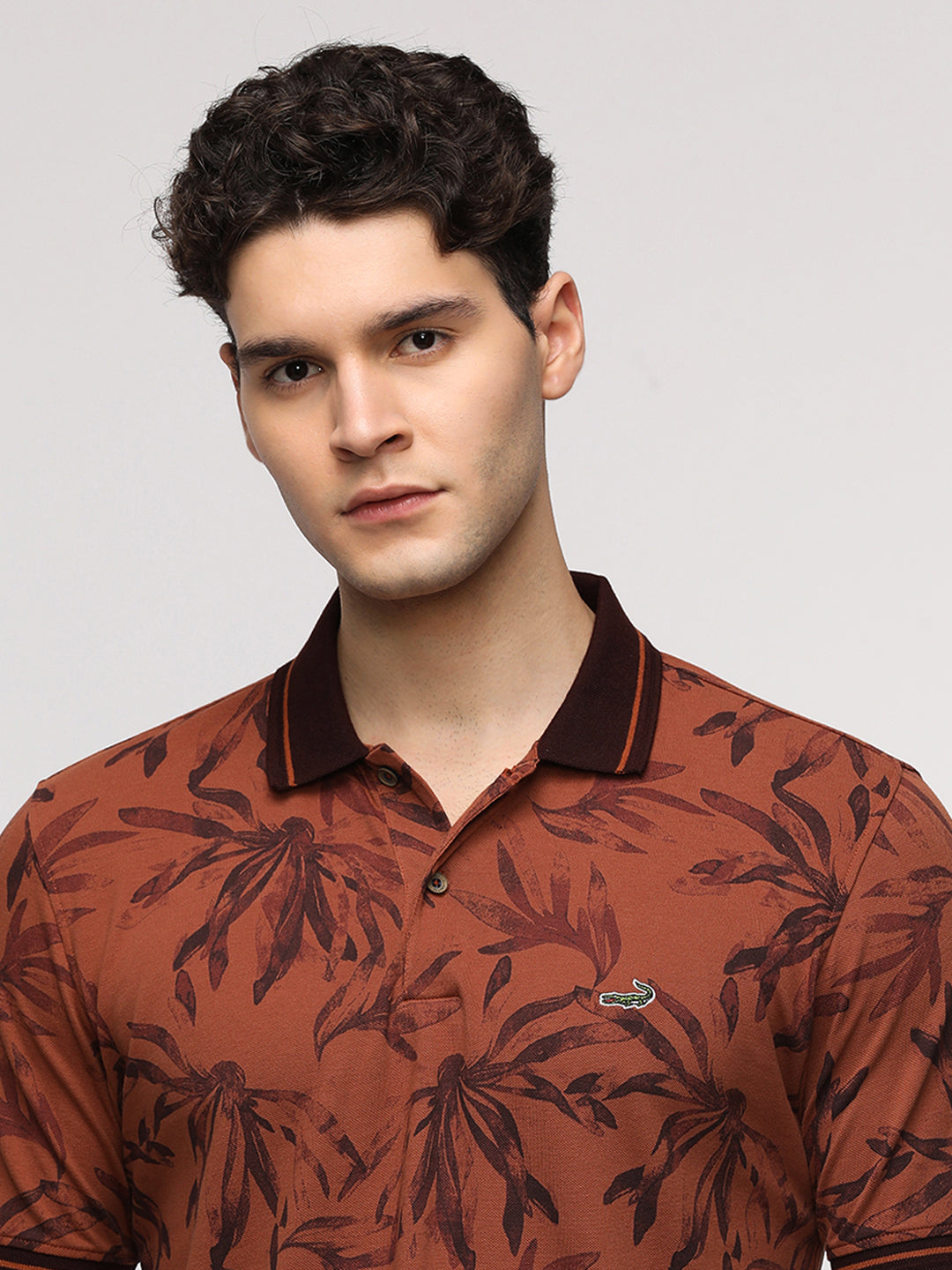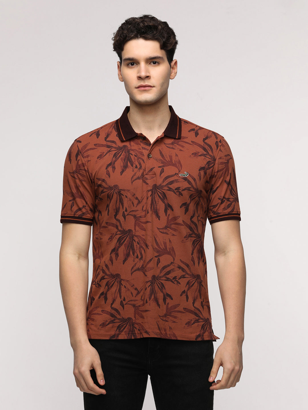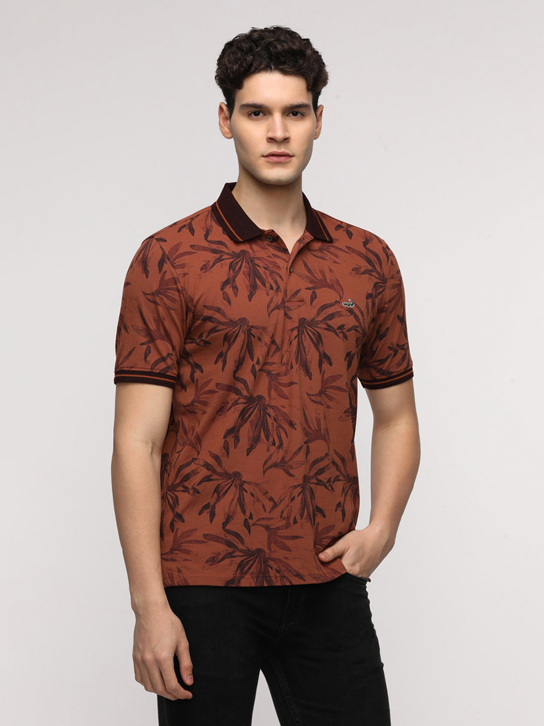 Abstract Tropical Leaf Printed Polo T-Shirt in Brown