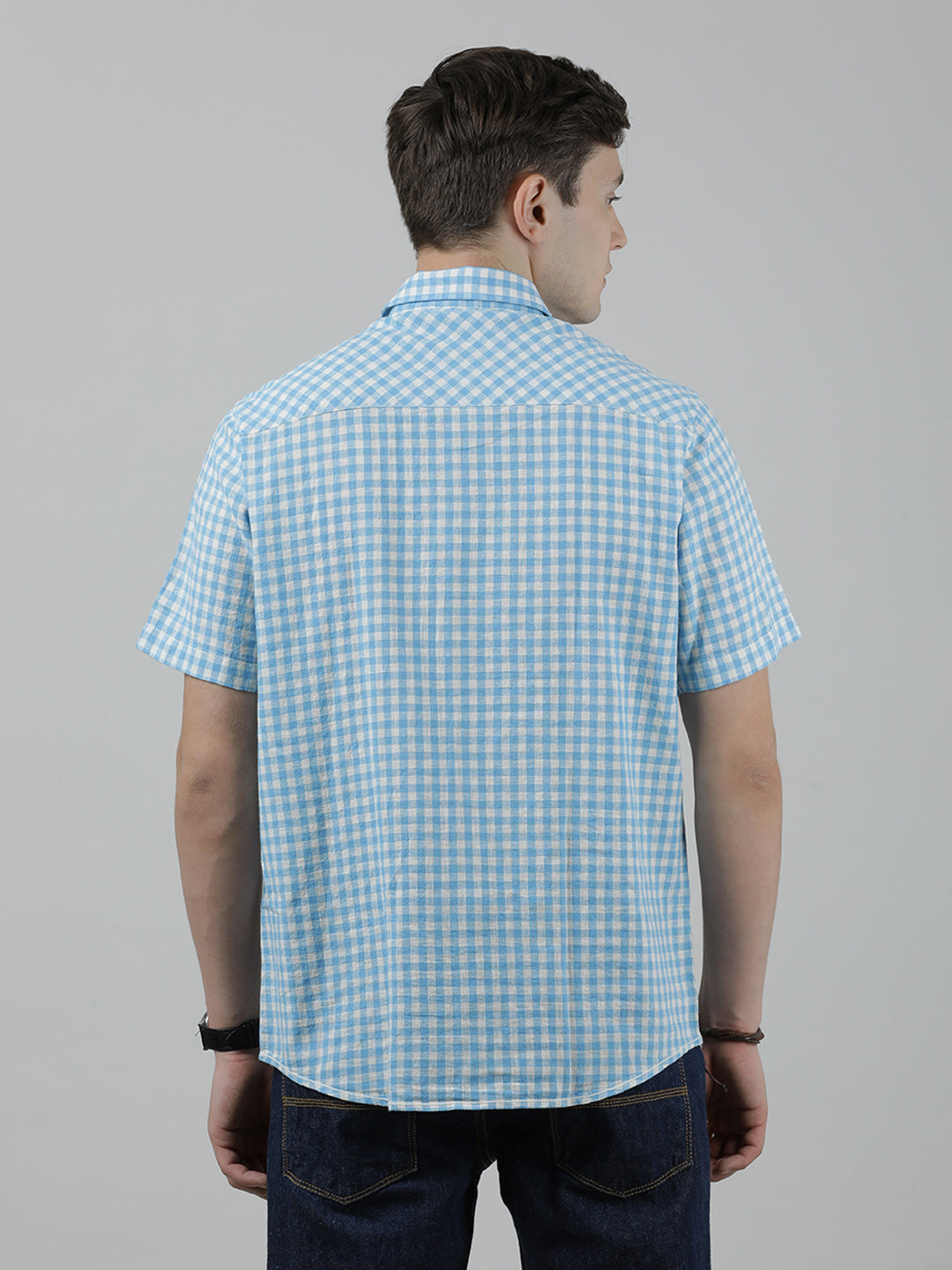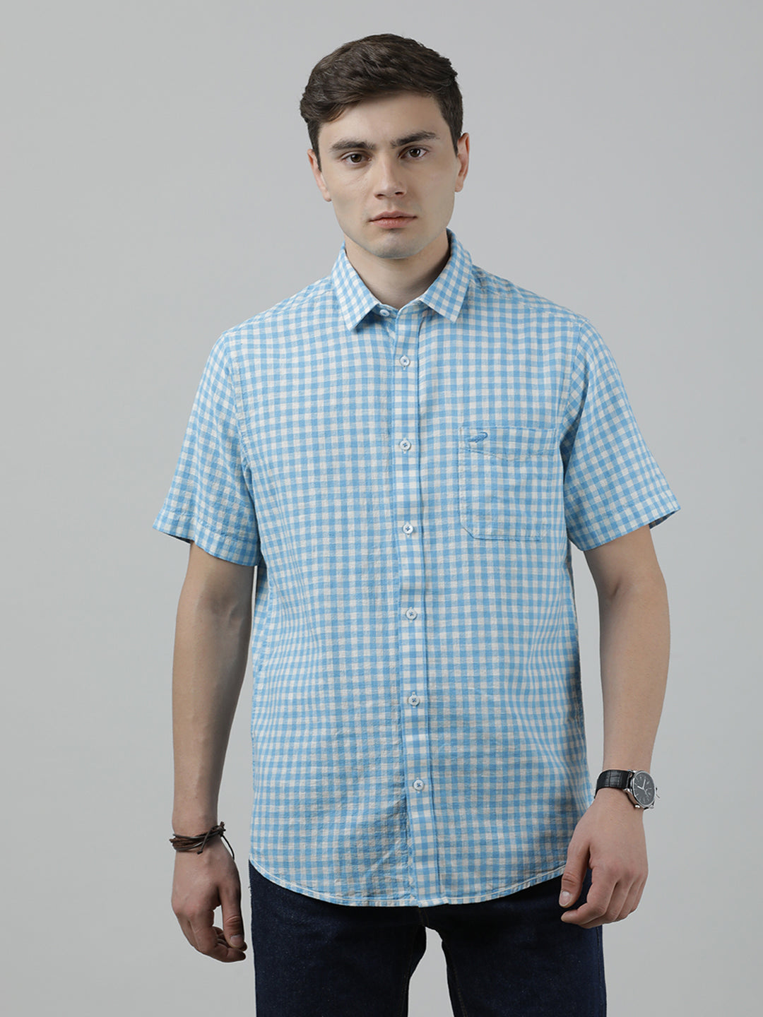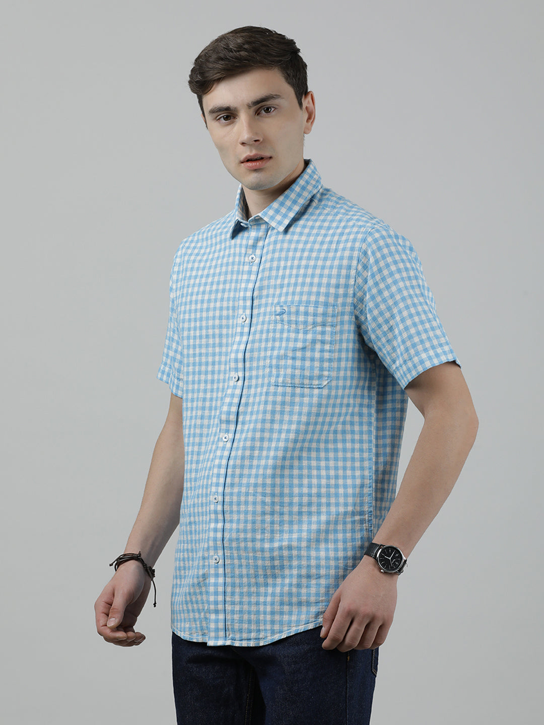 Aqua Blue Checked Half Sleeve Linen Shirt