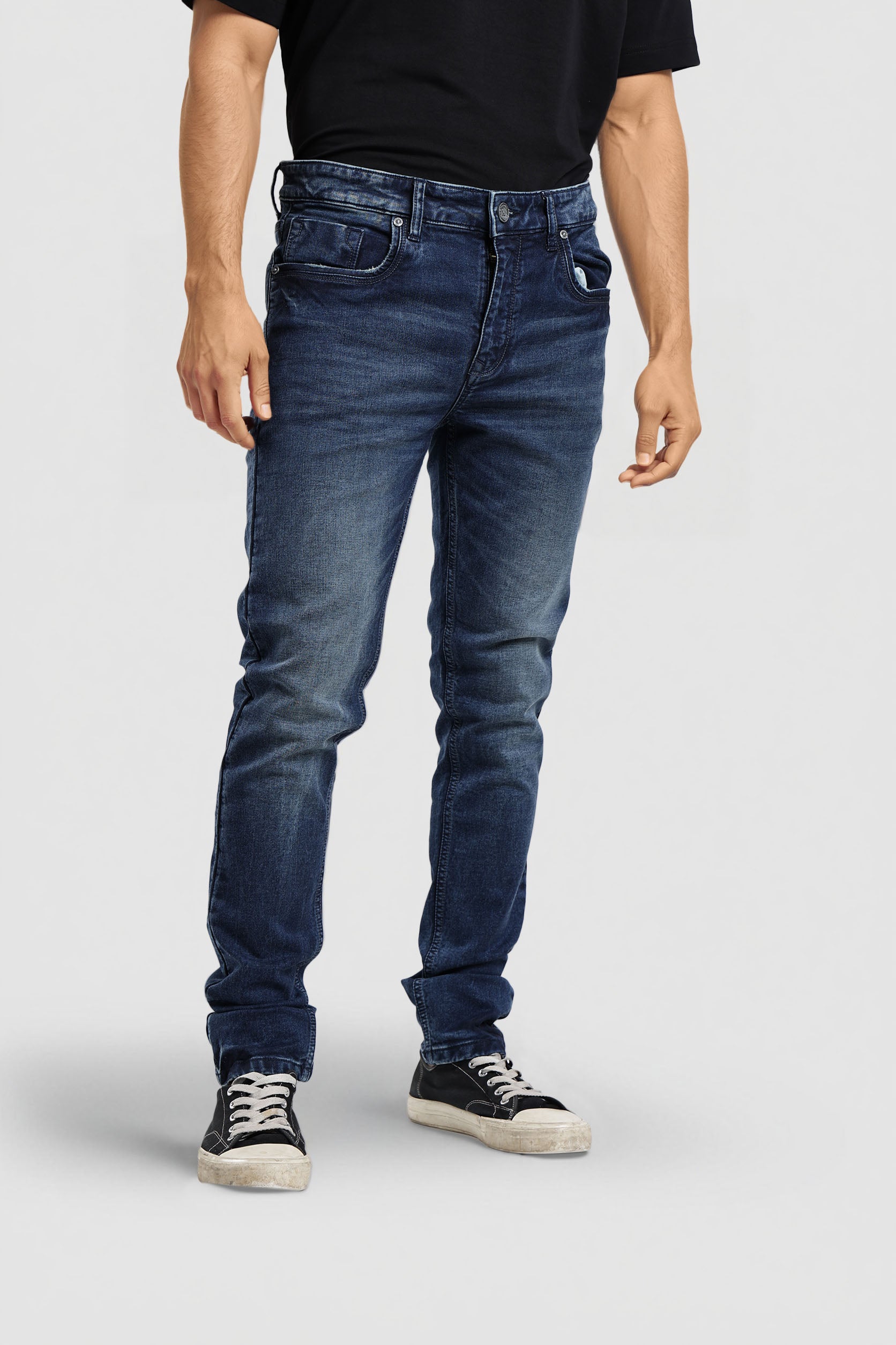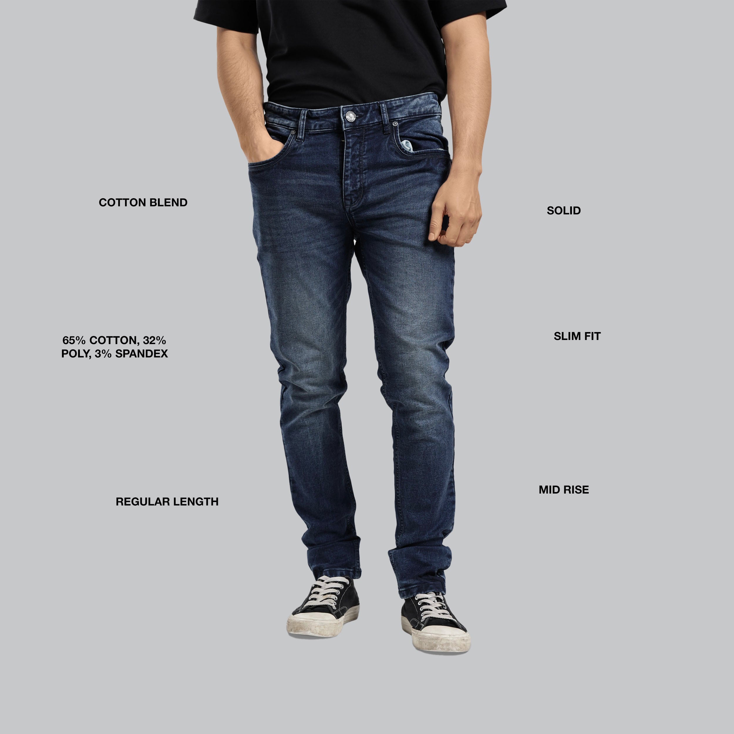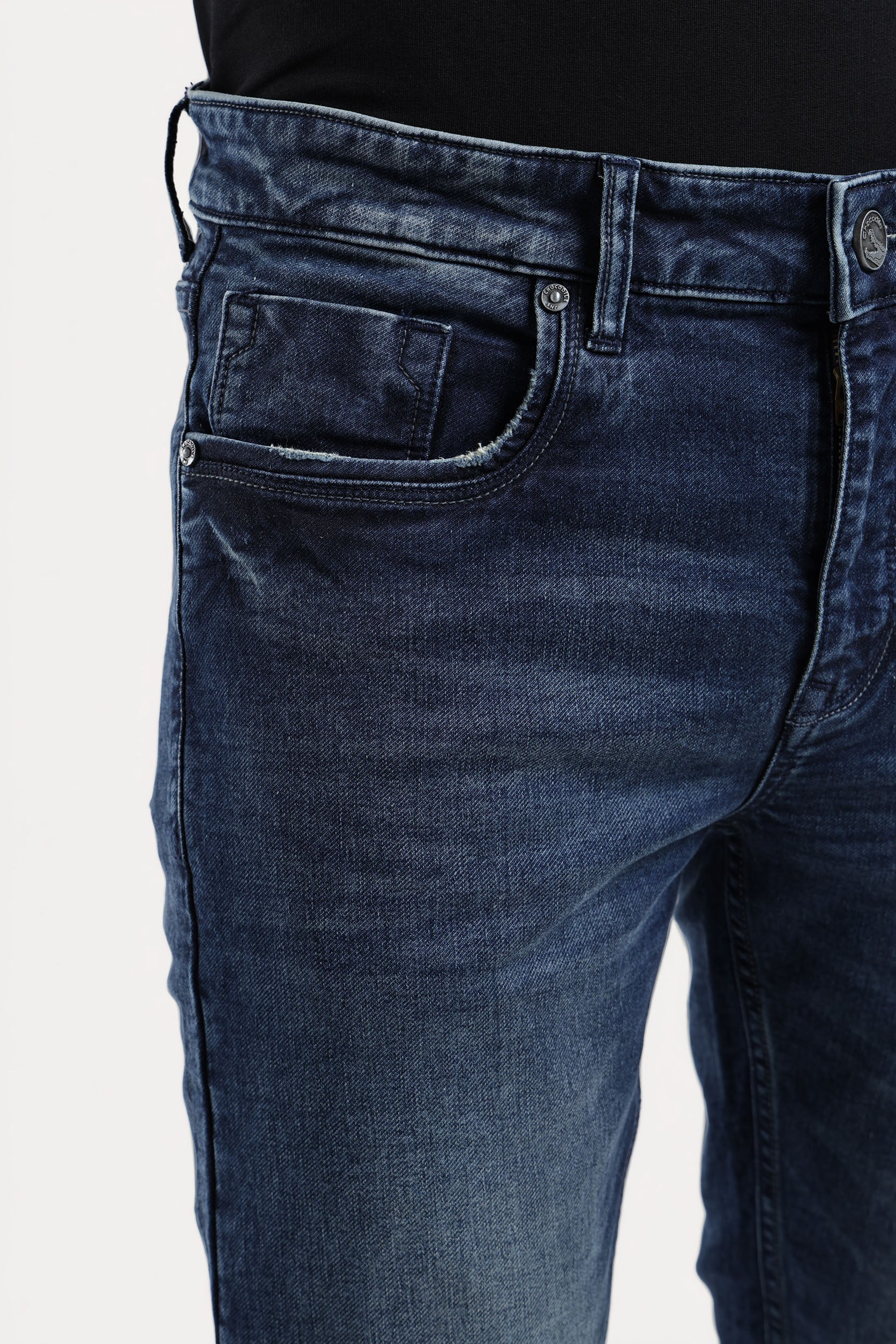 Blue Knitted Fabric Rugged Appeal Mild Grinded Pocket Edges Slim Fit Jeans