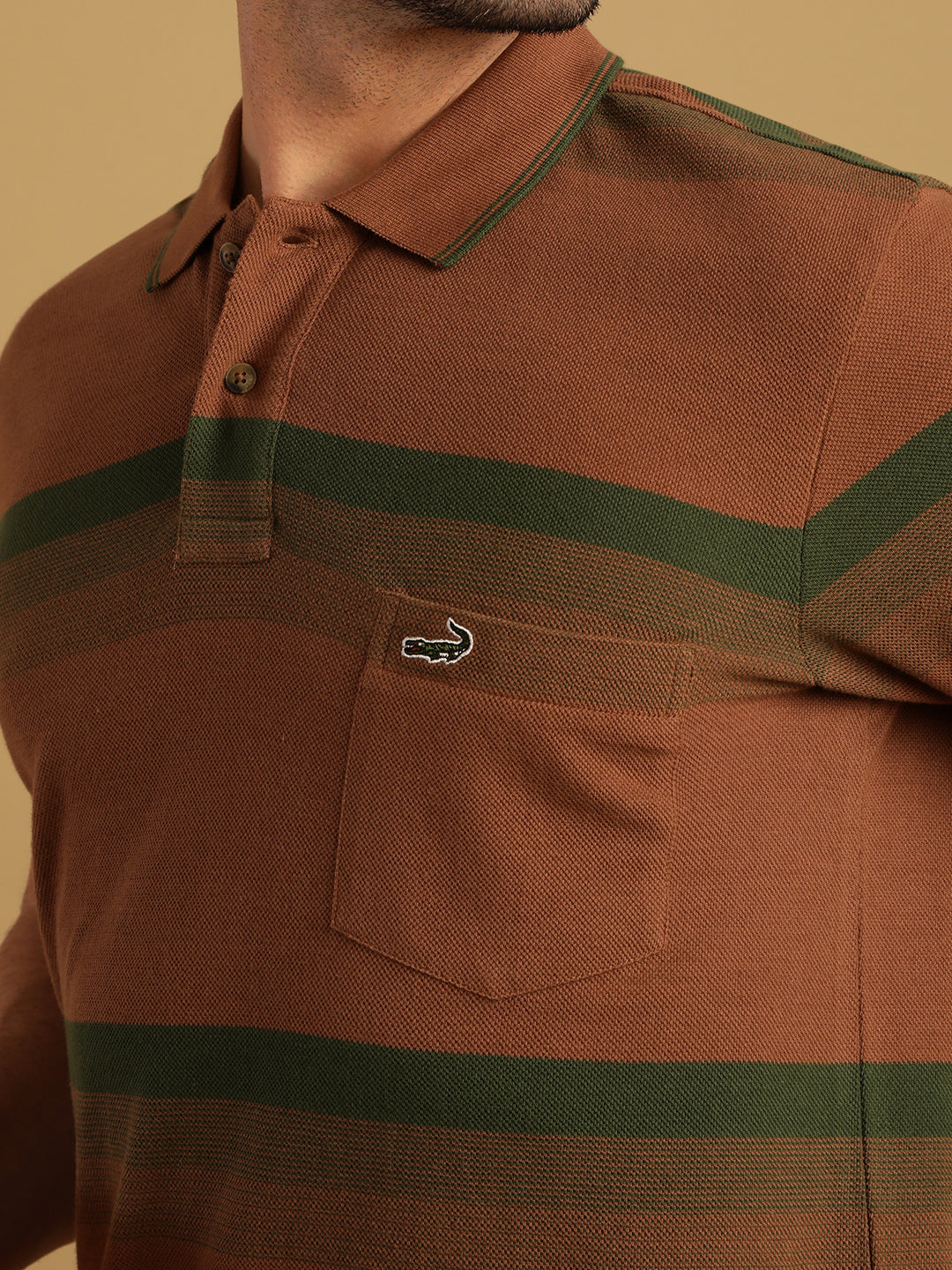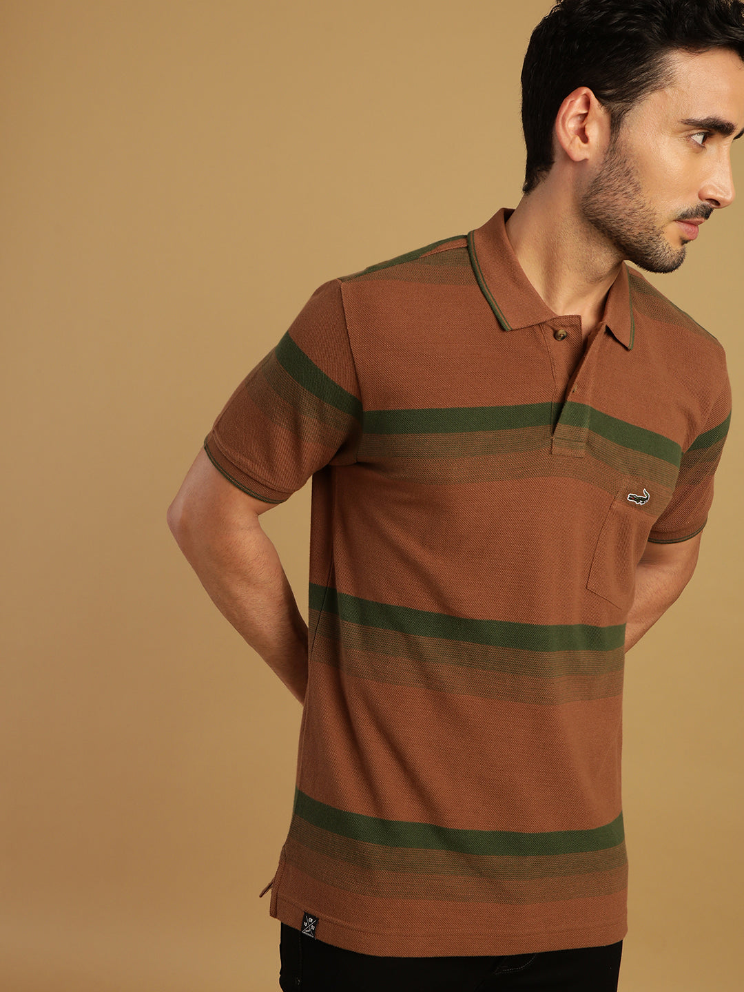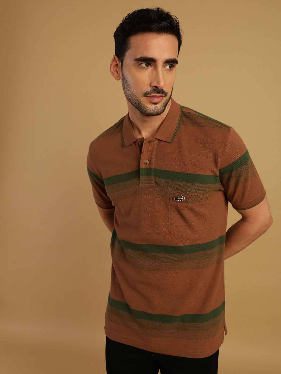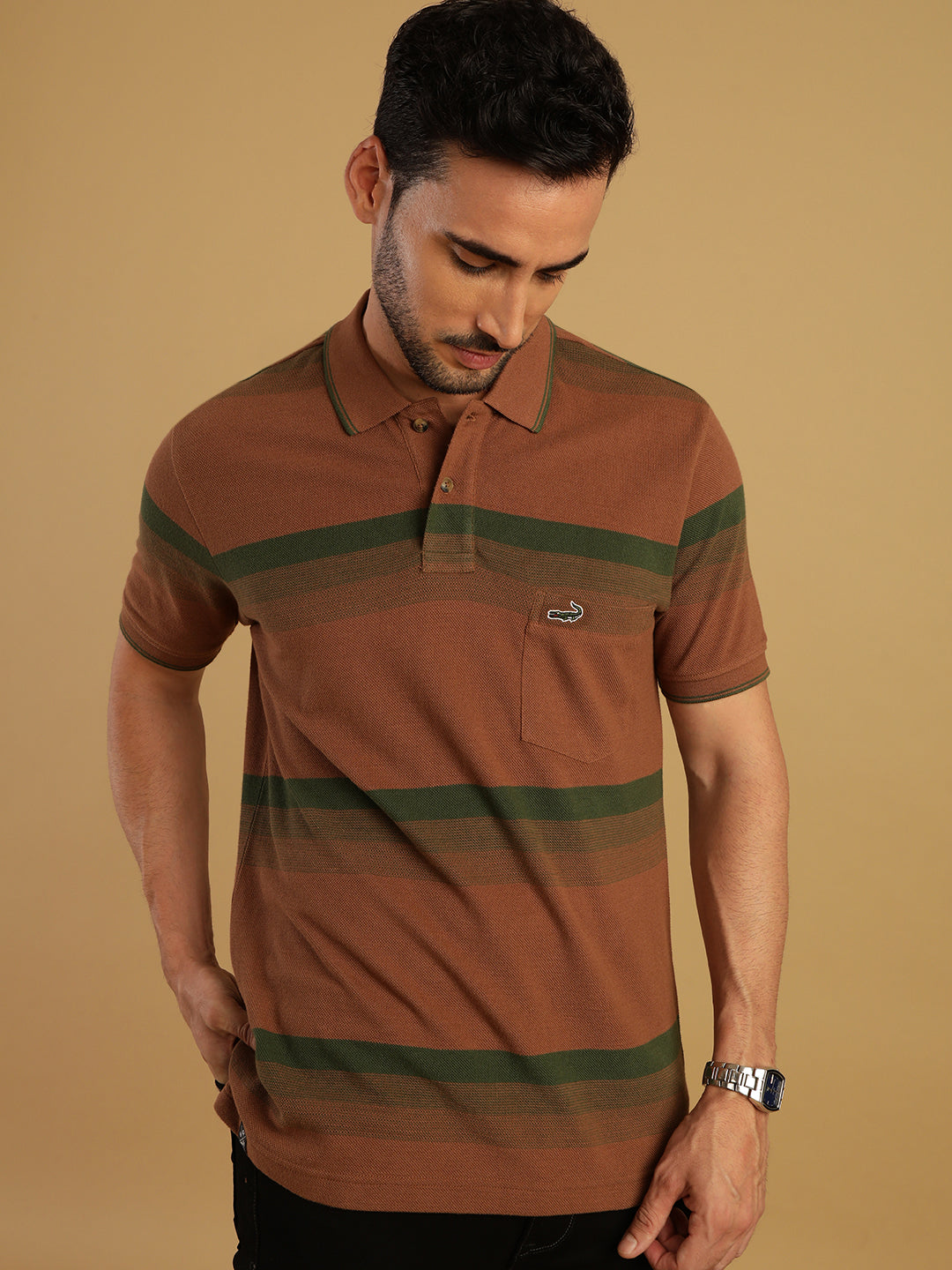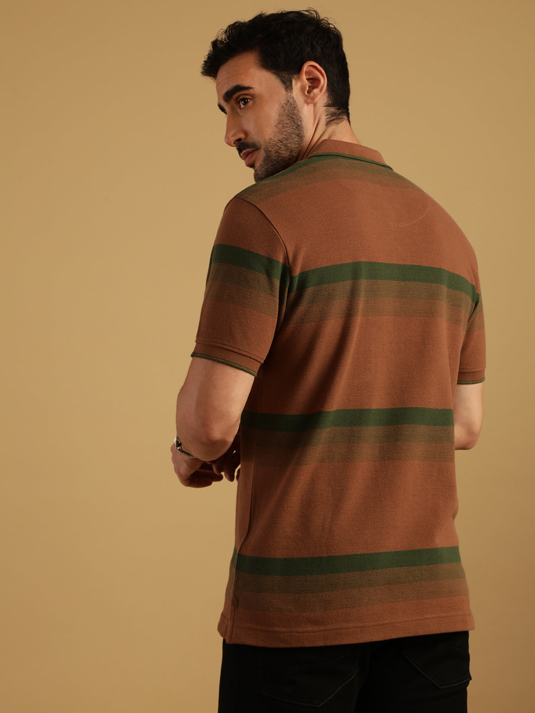 Brown Striped Casual Polo T-Shirt