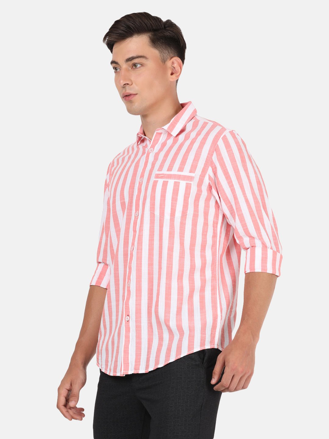 Coral Red Striped Full Sleeve 100% Cotton Shirt