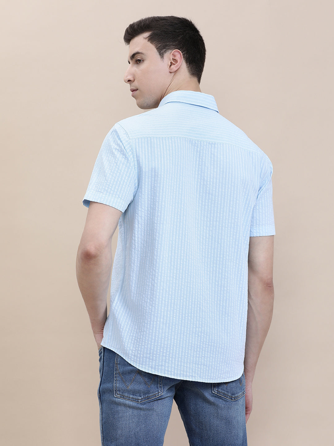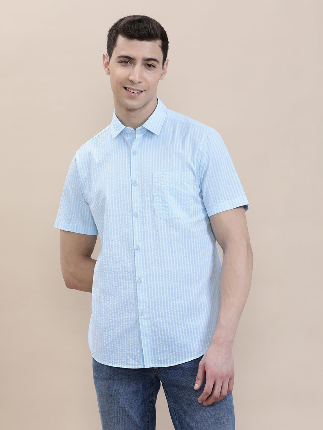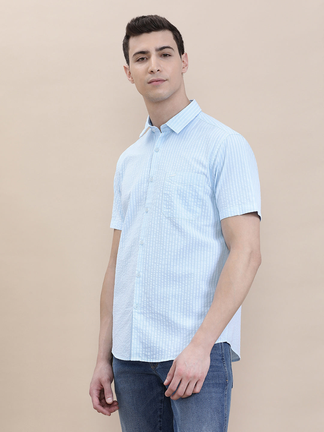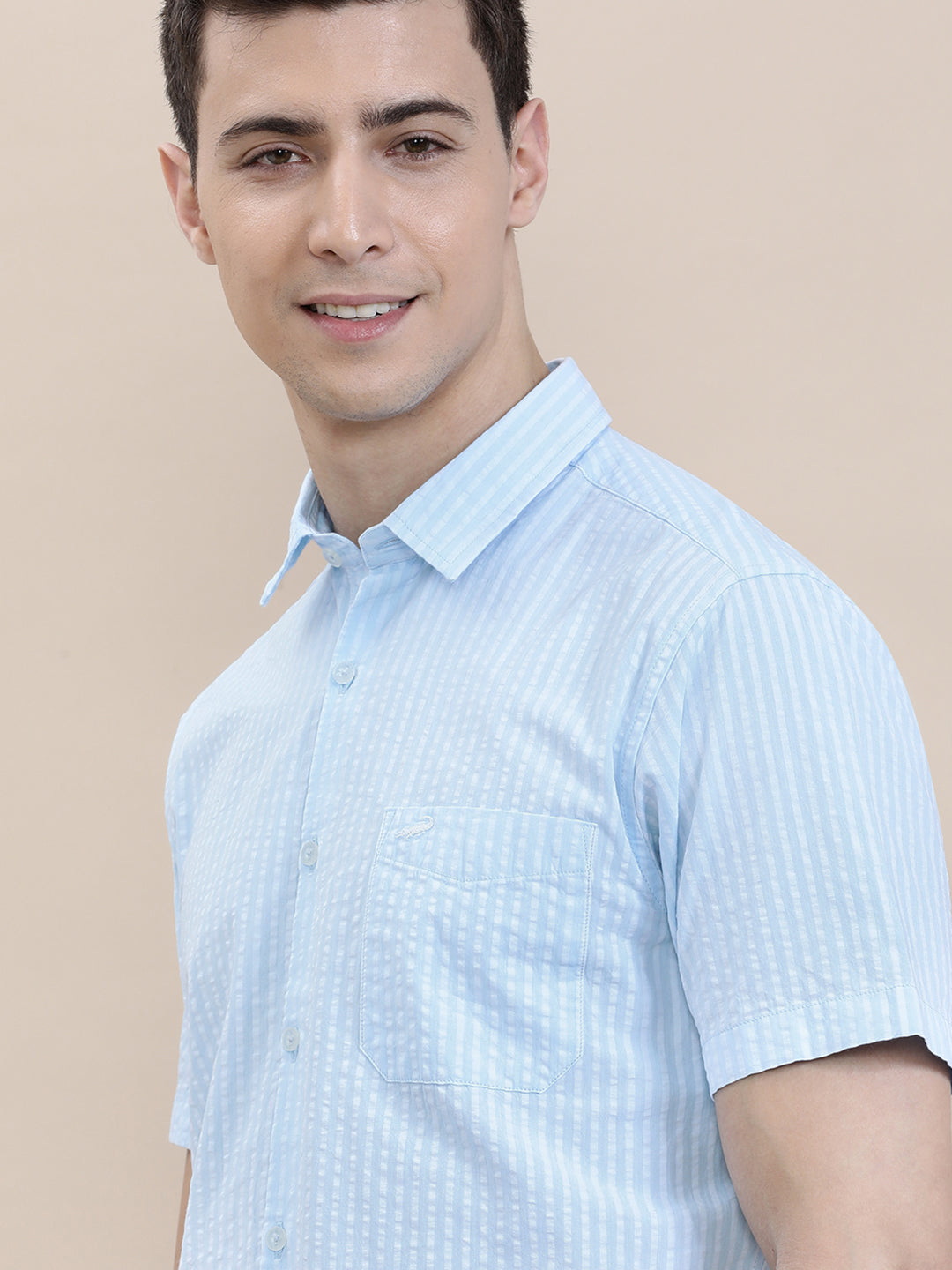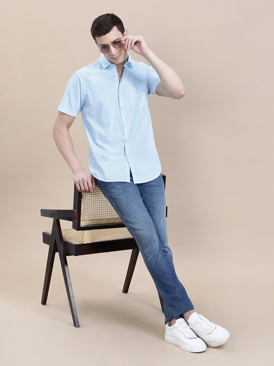Cotton Seersucker Blue Striped Half Sleeve Shirt