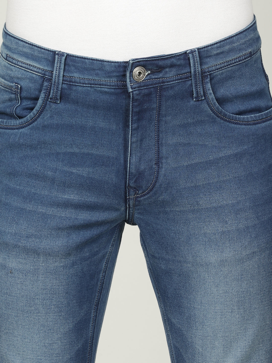 Dark Blue Solid Mid Rise Casual Slim Tapered Jean
