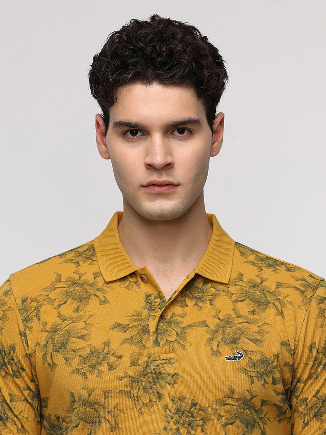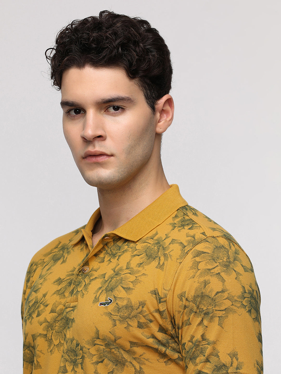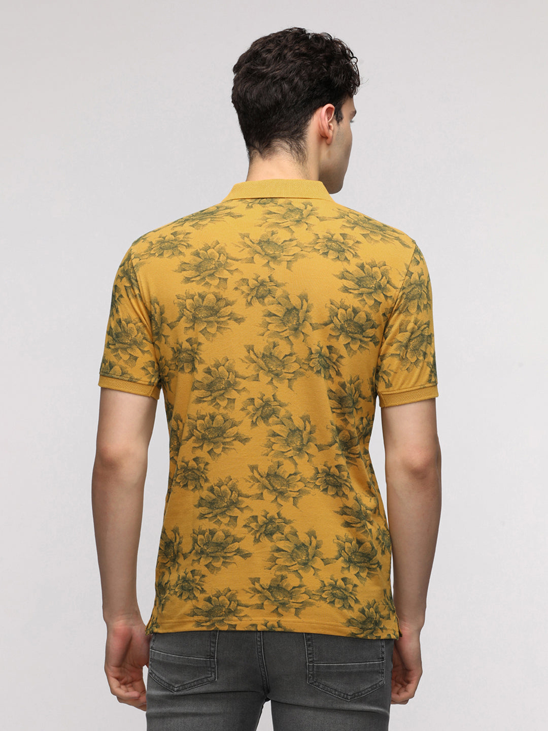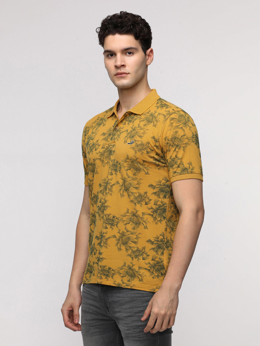 Floral Abstract All Over Print Polo T-Shirt in Mustard