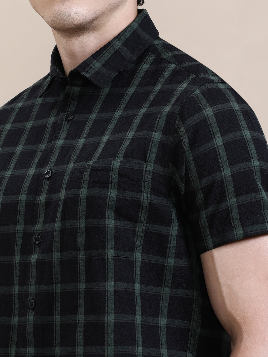 Linen Blend Black Checked Half Sleeve Shirt