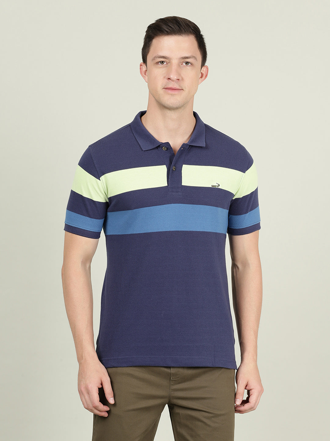 Mid Blue Striped Casual Polo T-Shirt