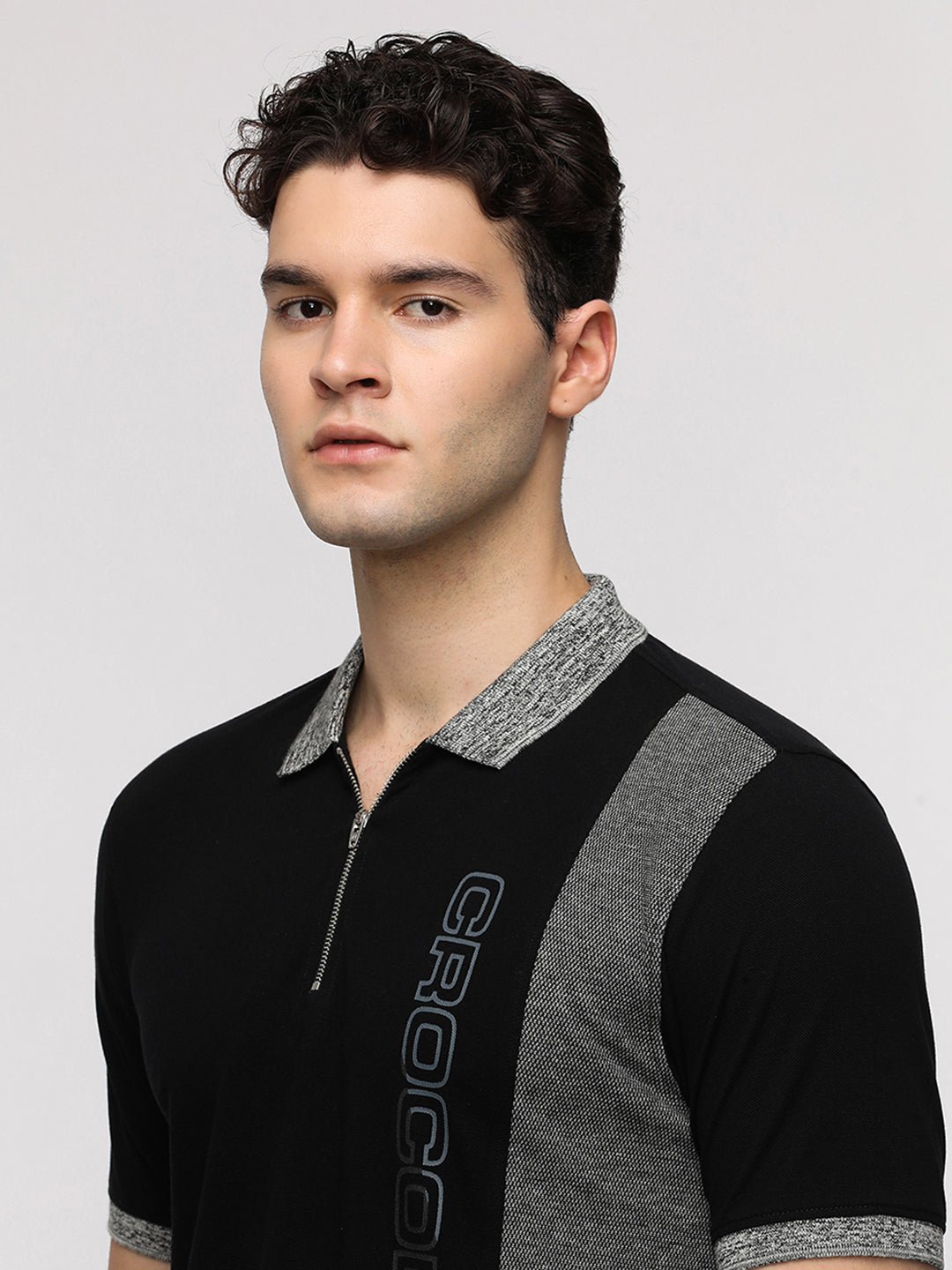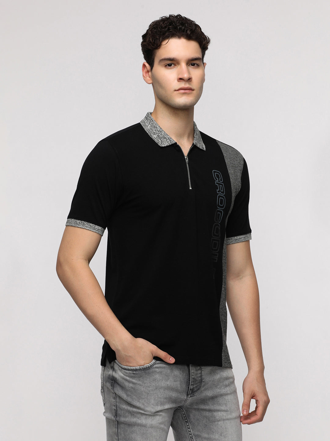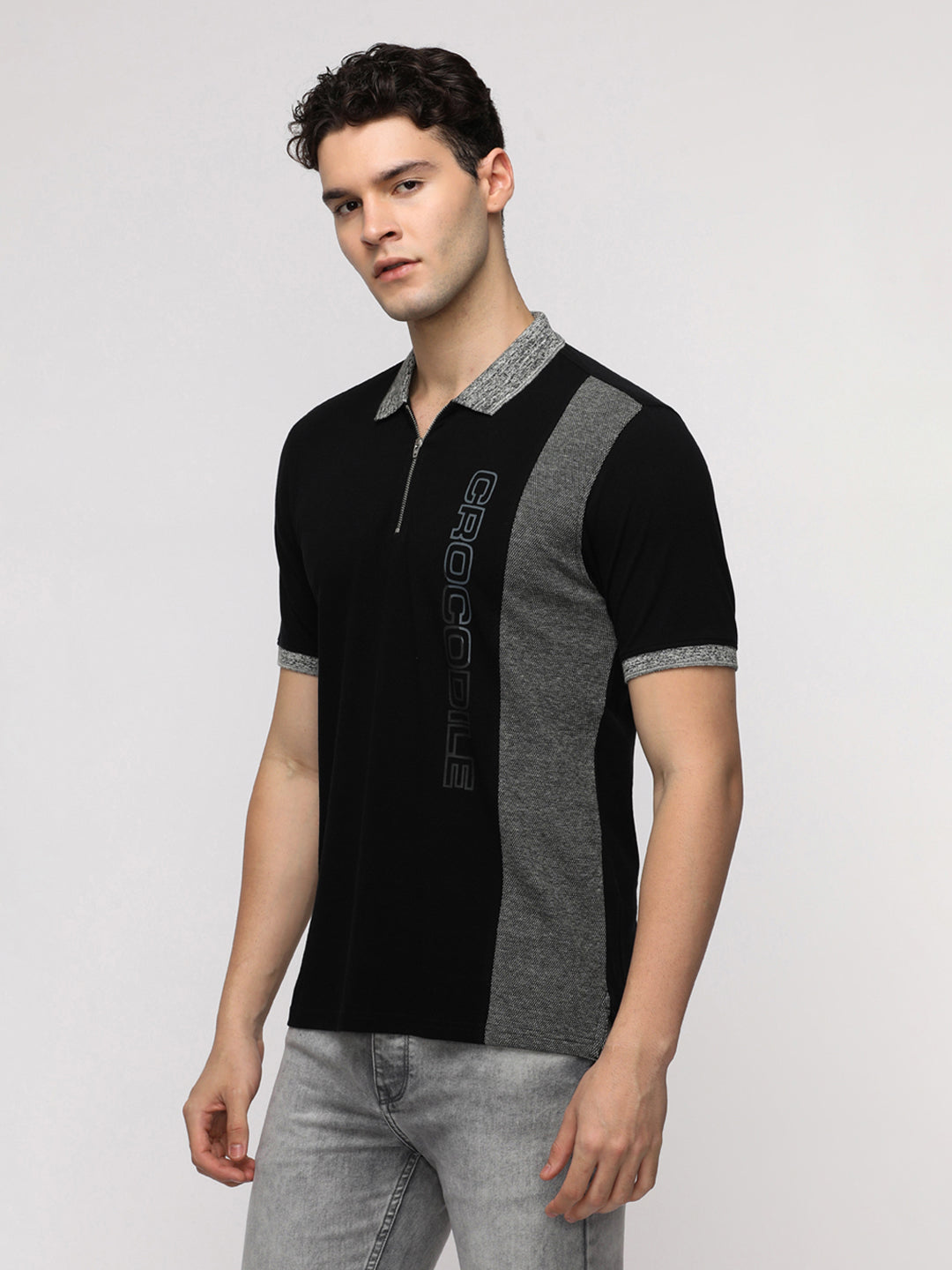 Vertical Colour-Blocking Zipper Polo T-Shirt in Jet Black