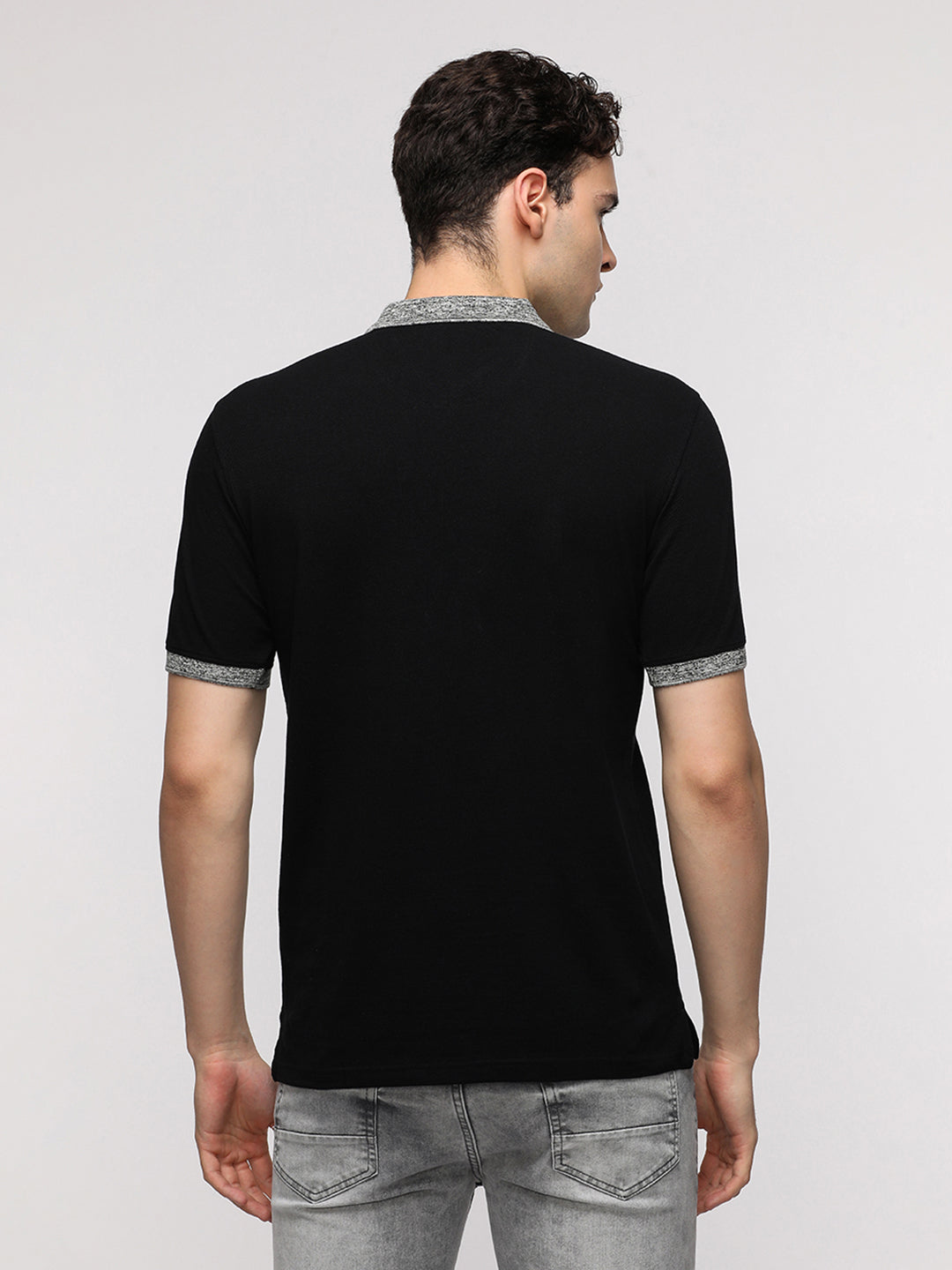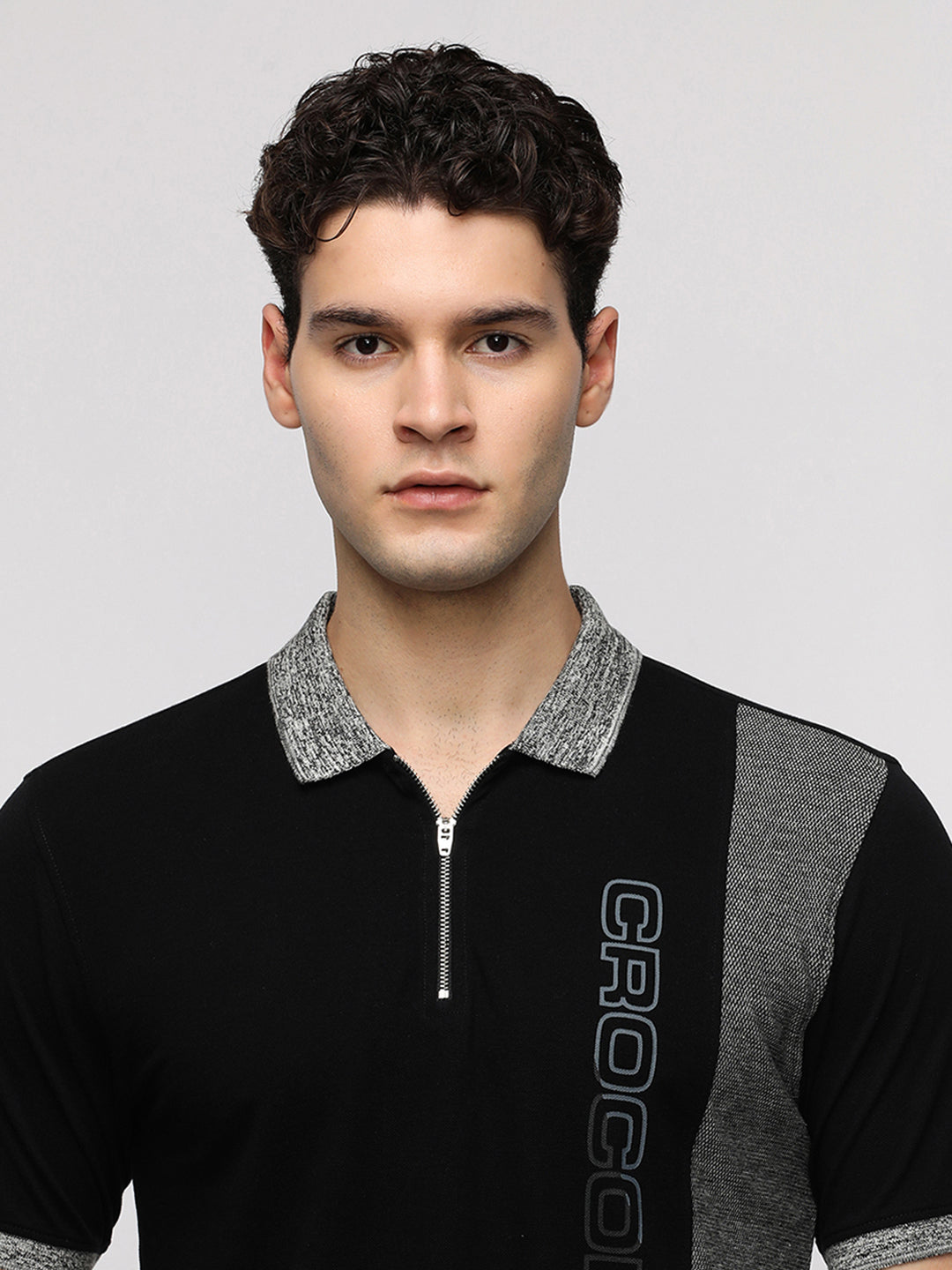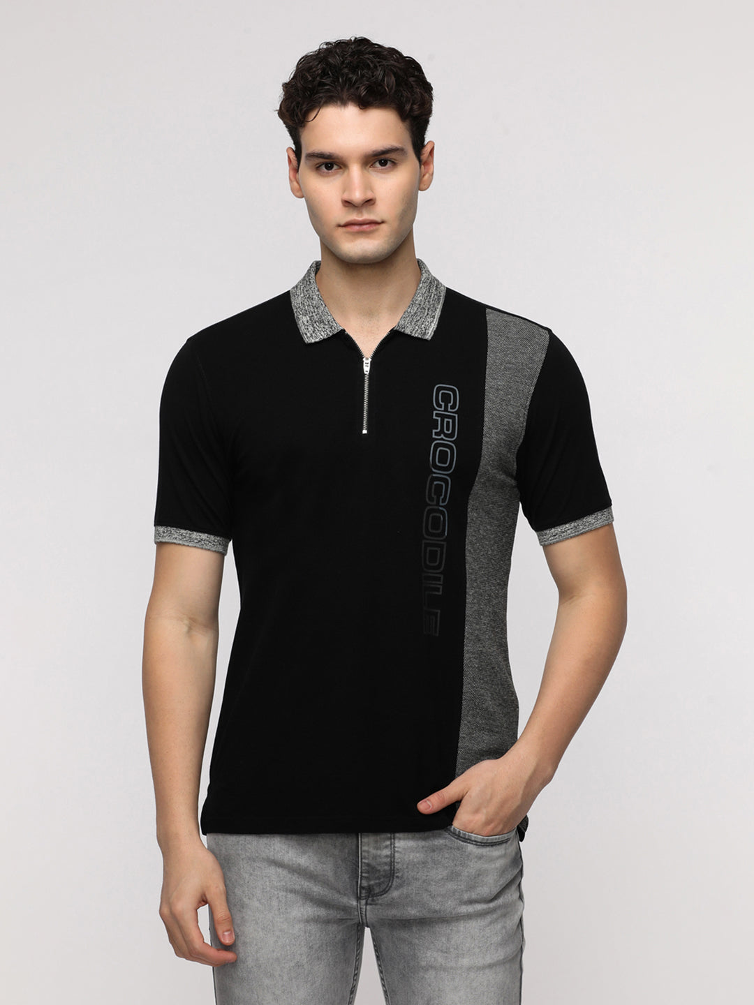Vertical Colour-Blocking Zipper Polo T-Shirt in Jet Black