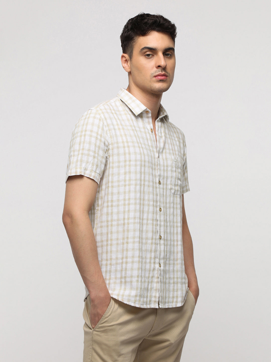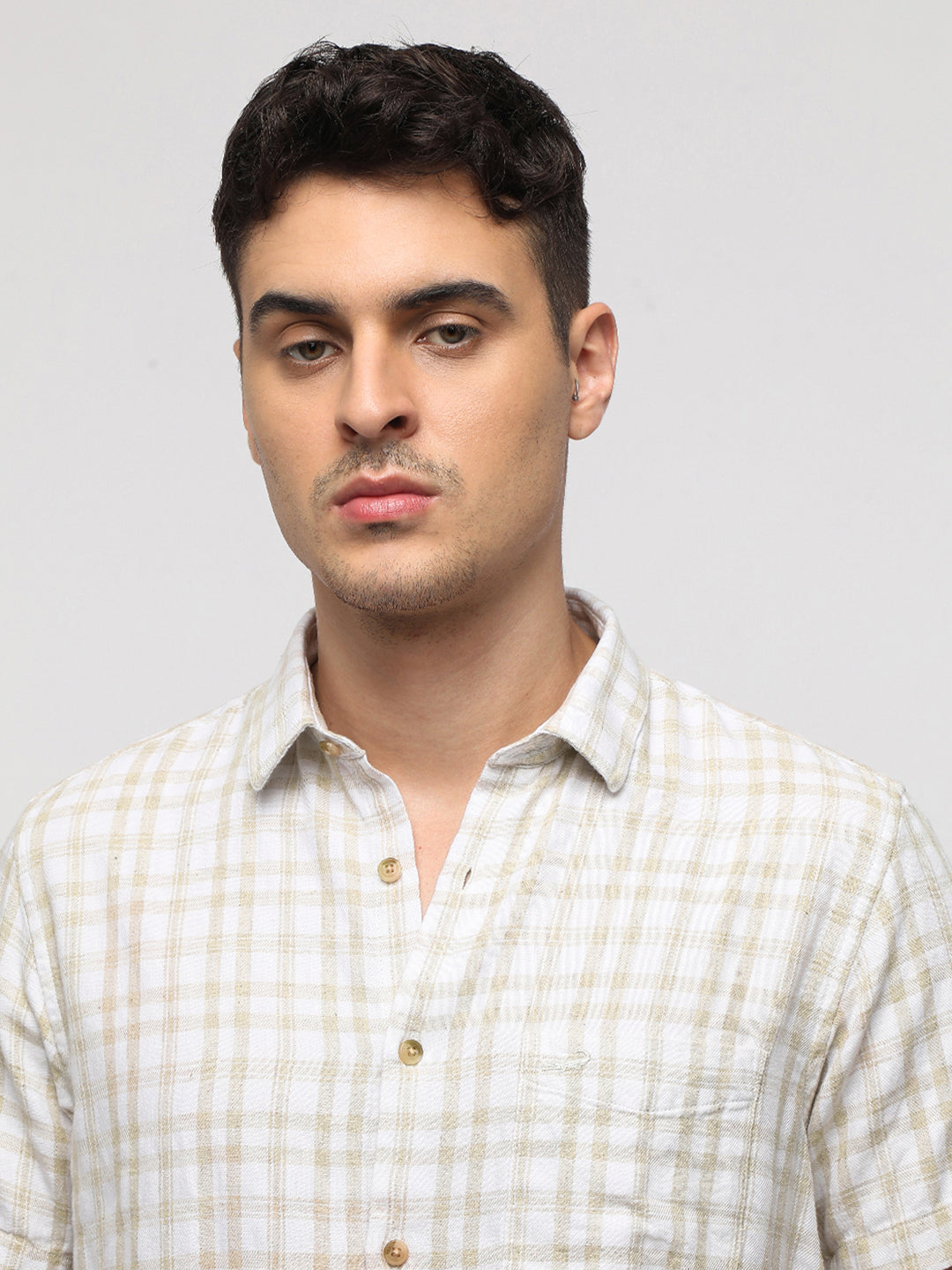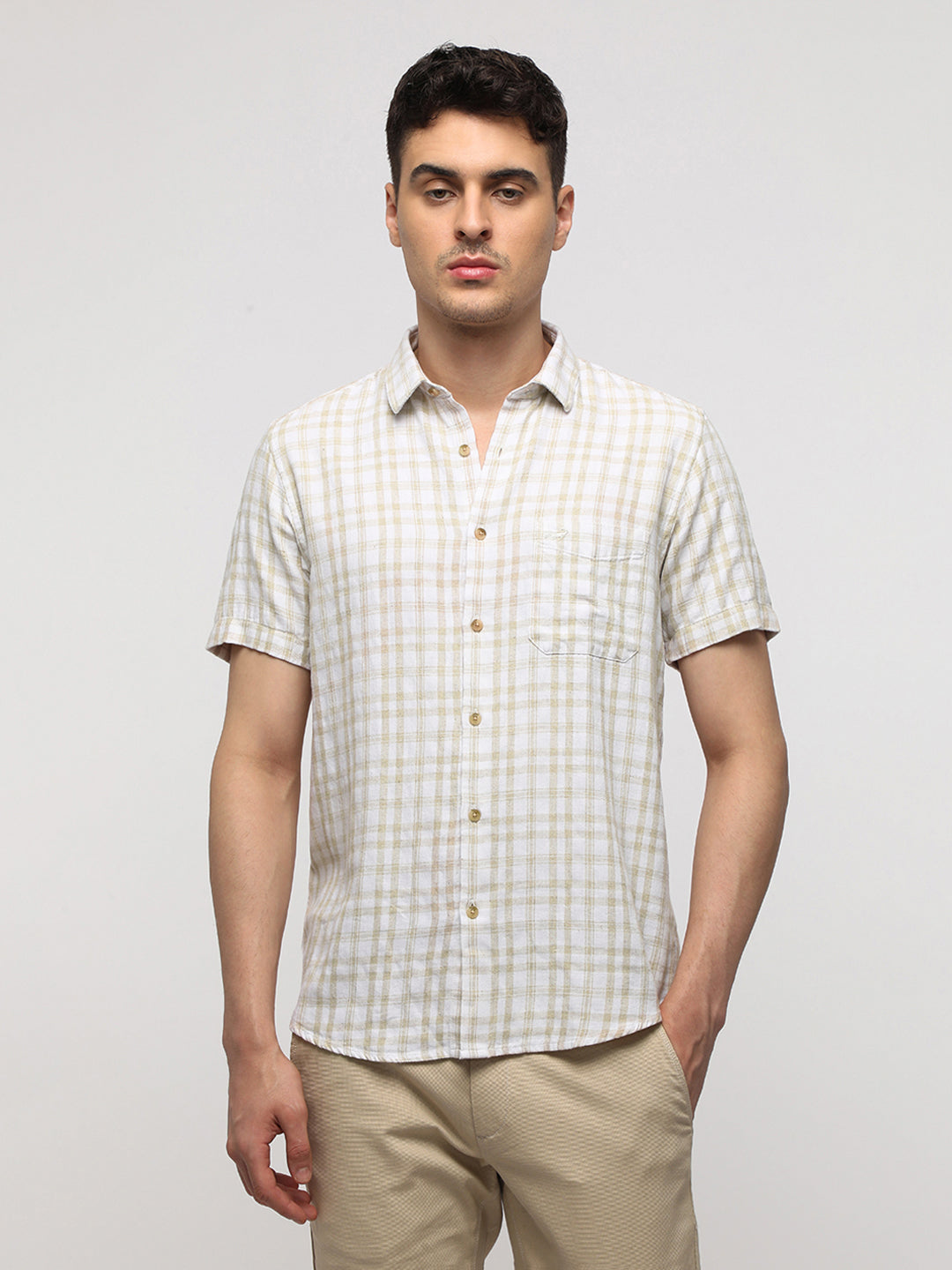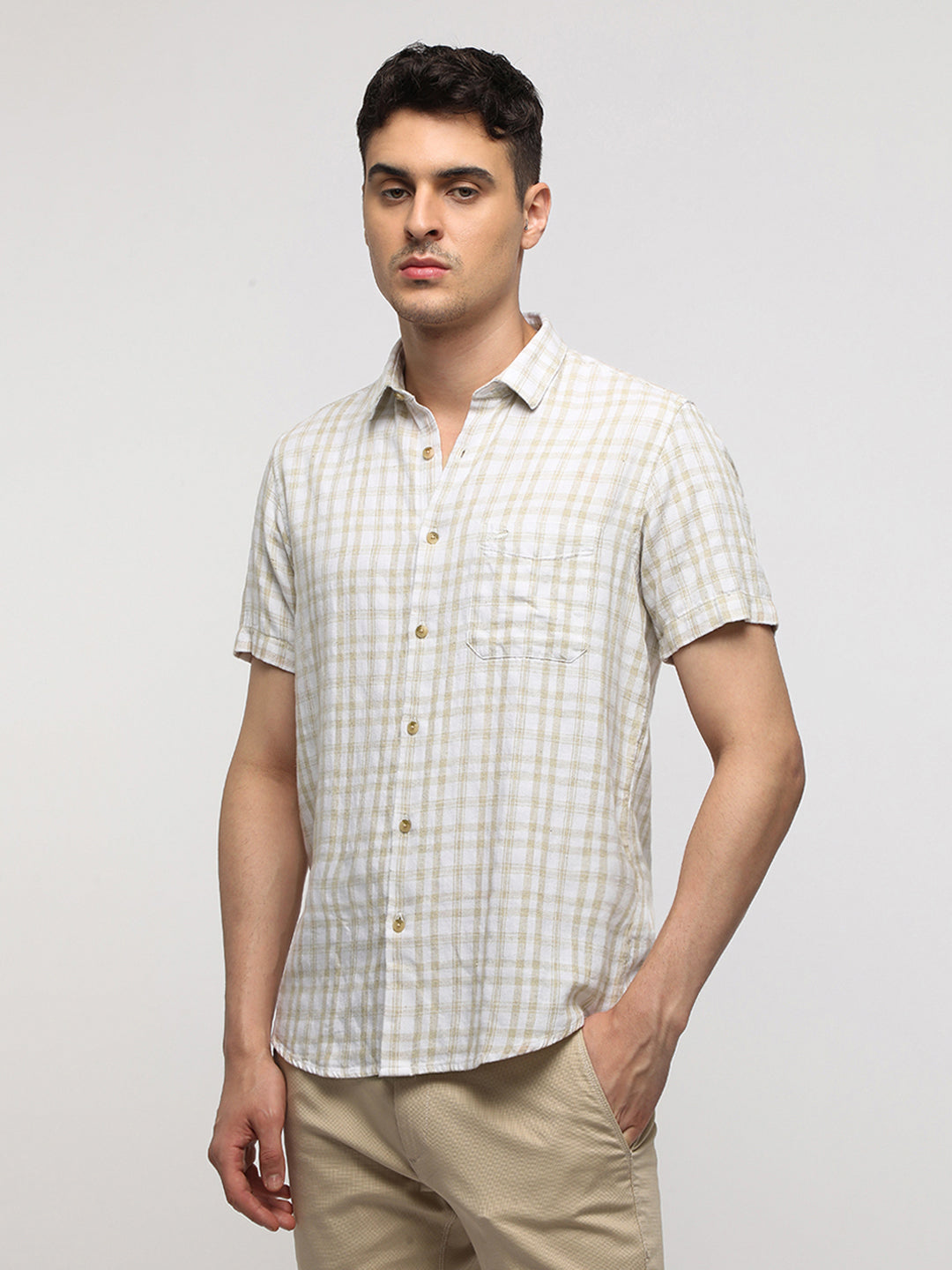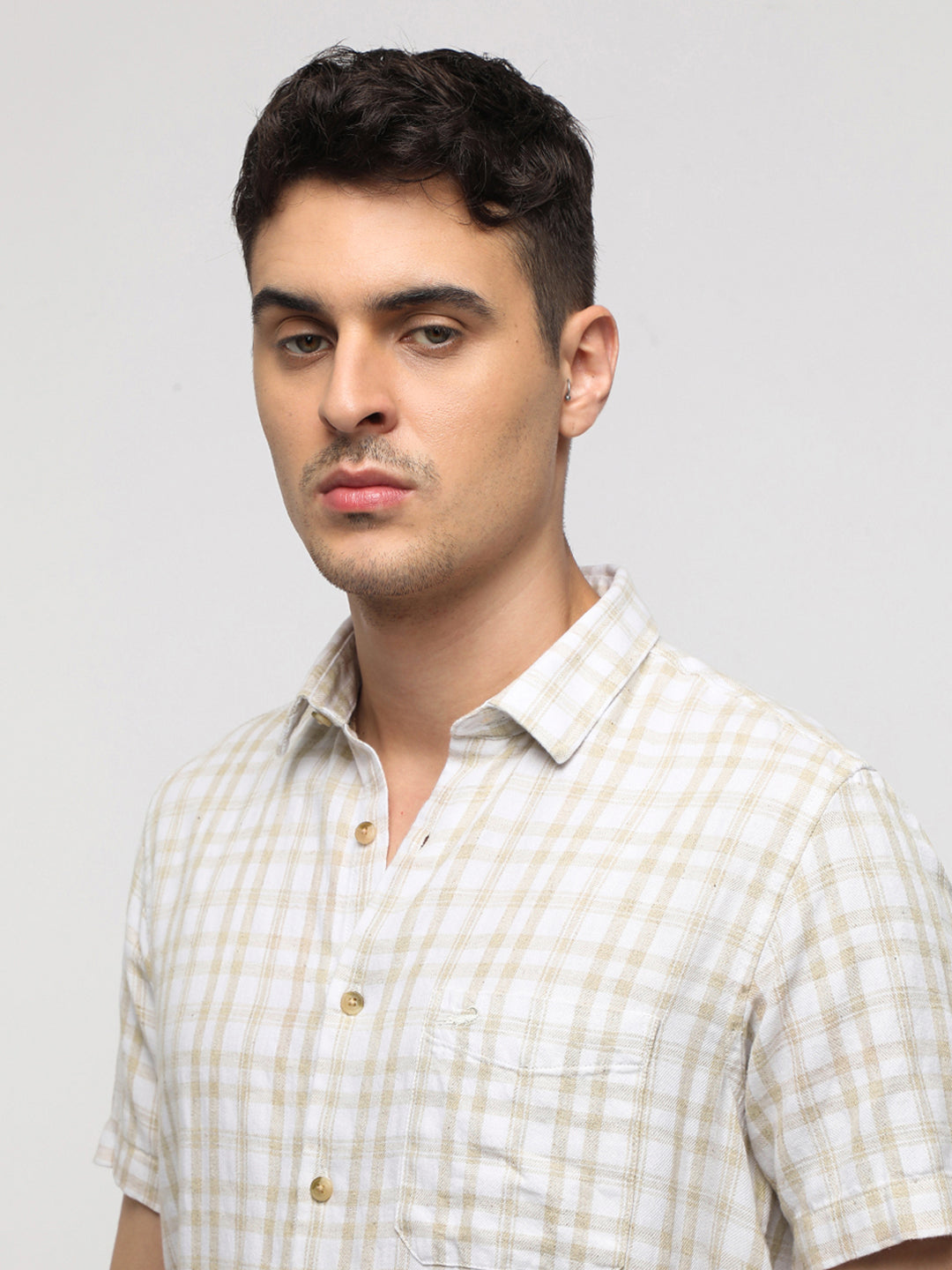 White Comfort Fit Checkered Natural Plaid Linen Blend Shirt
