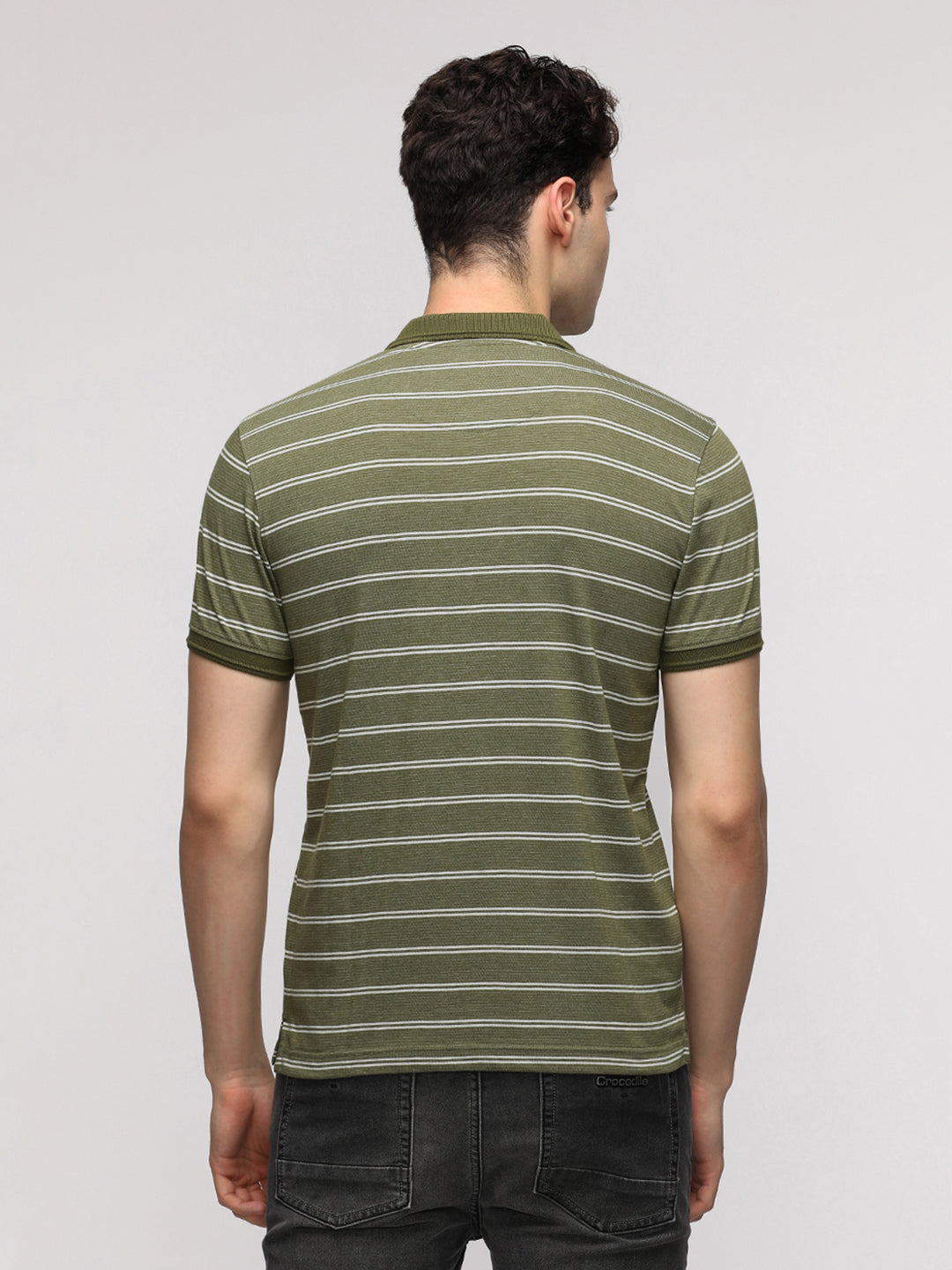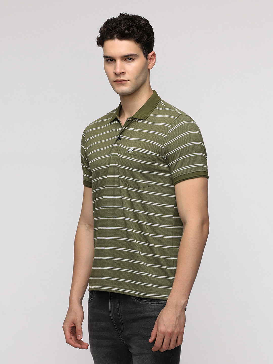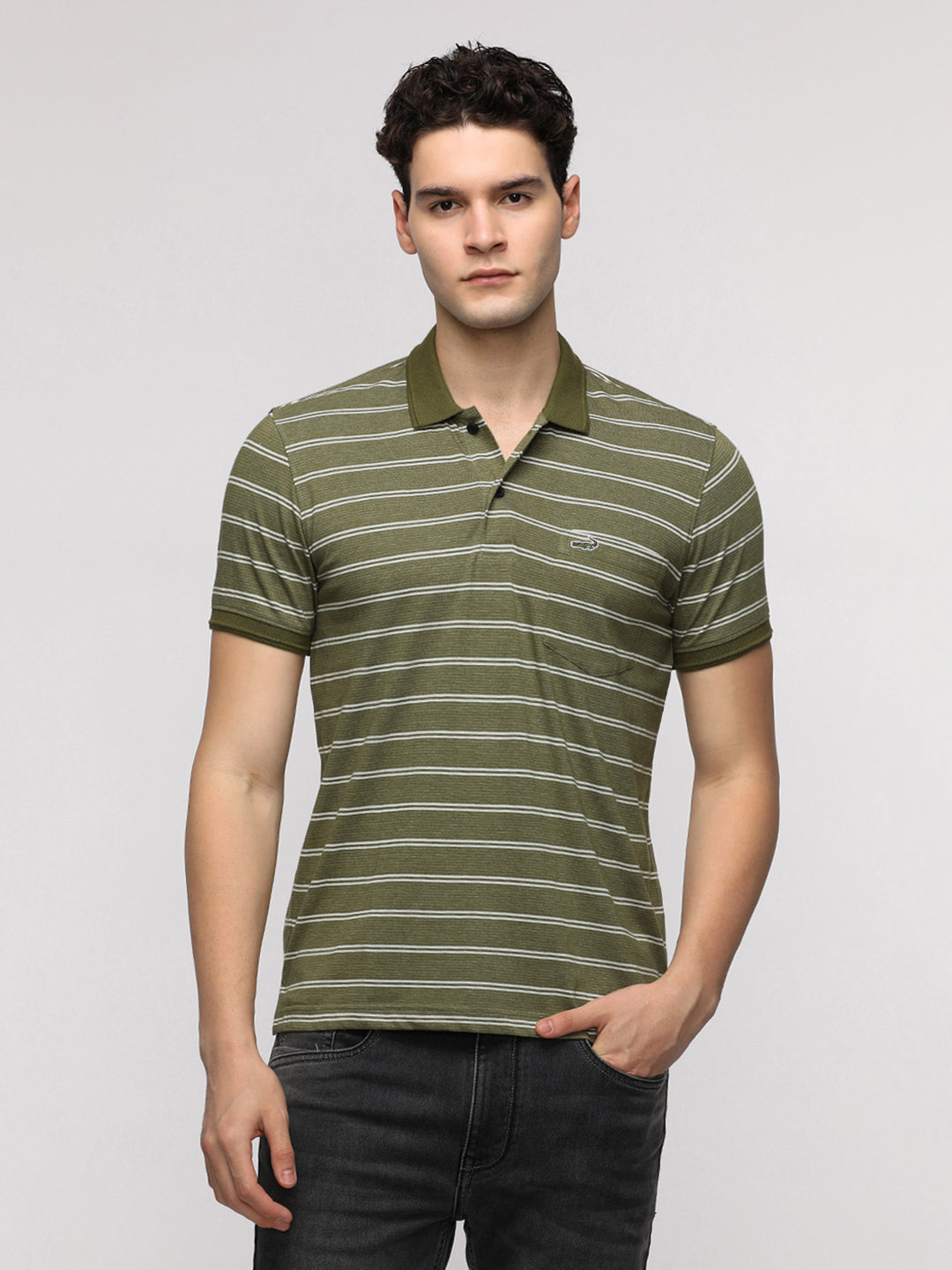 Yarn Dyed Micro Stripe Polo T-Shirt in Olive with Pocket